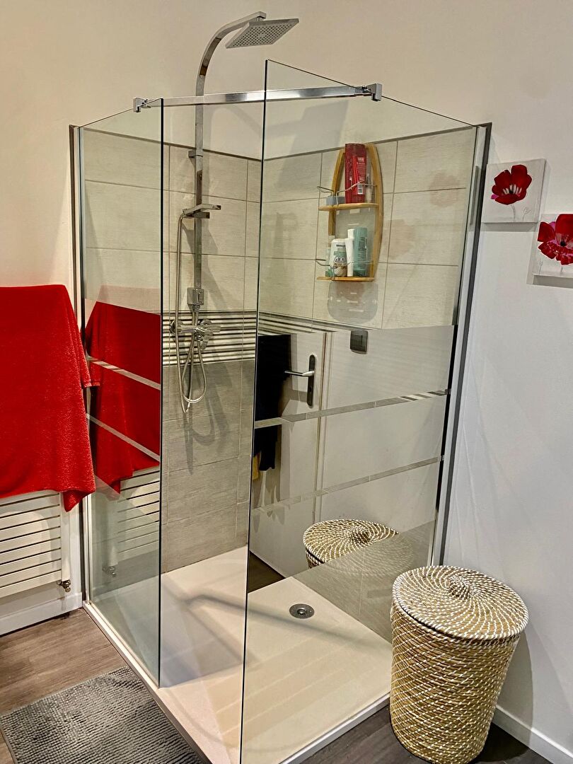 Confort : Une salle de bains fonctionnelle et élégante propose à la fois une douche moderne et une baignoire relaxante.