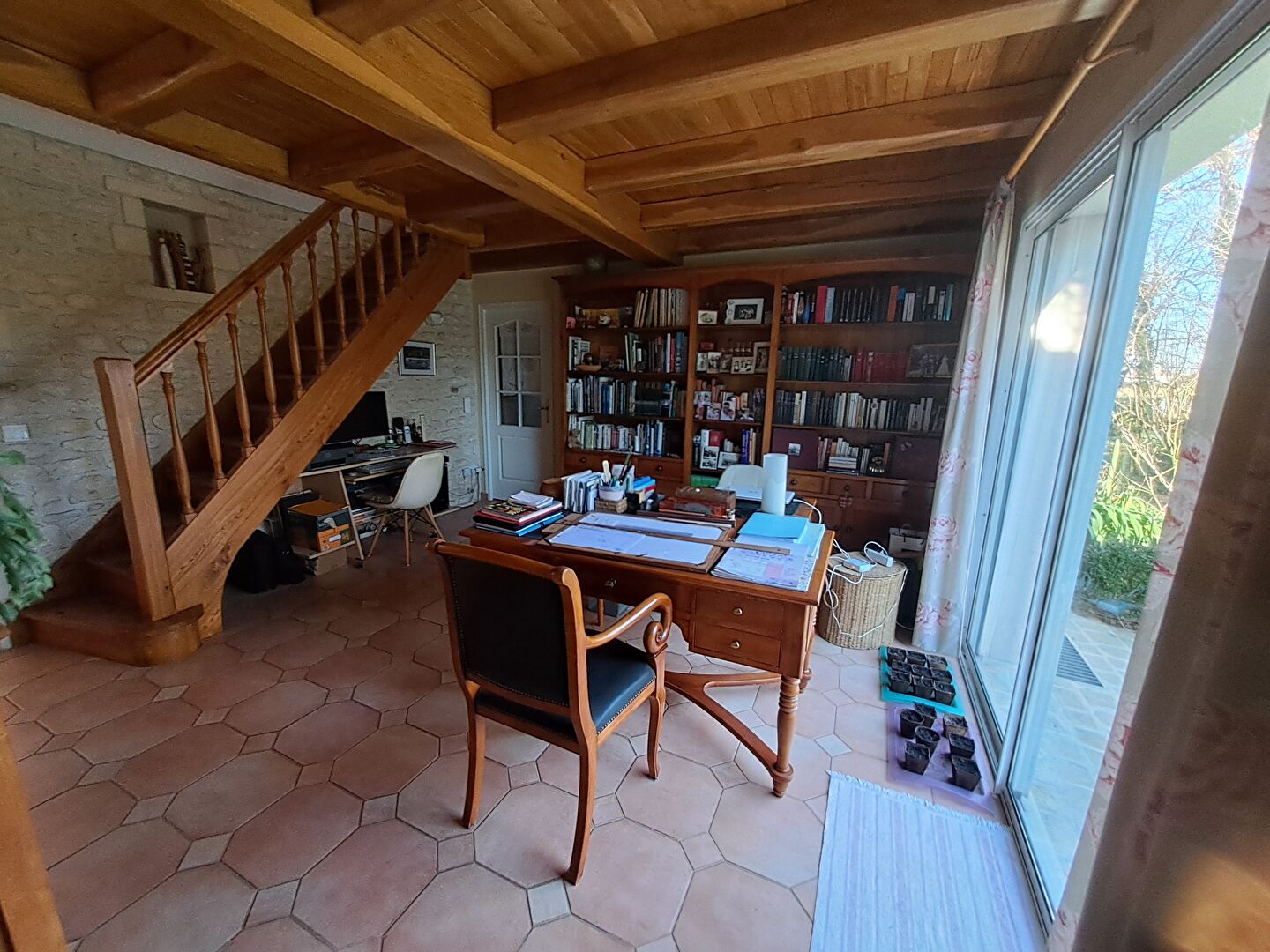 Pièce de vie lumineuse, un pièce pouvant servir de bureau/bibliothèque ou salon