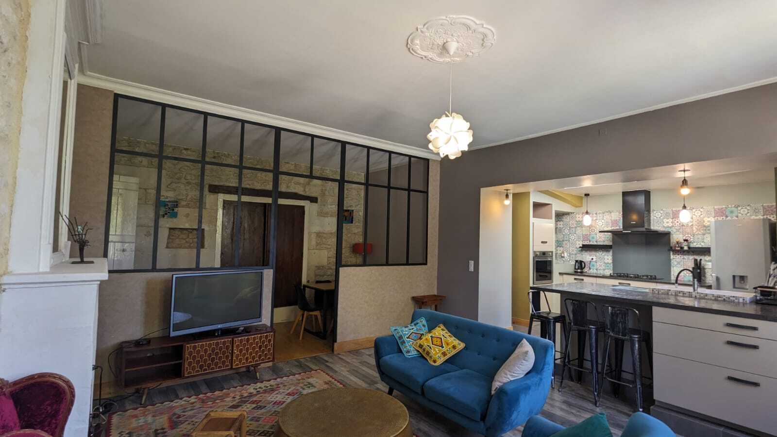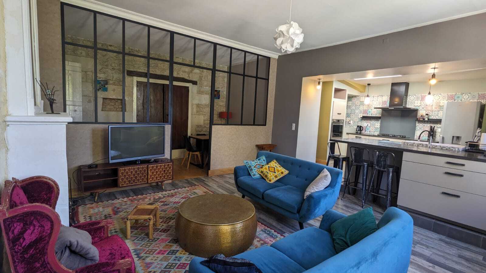 L'espace de vie offre une belle superficie, mêlant la chaleur de la pierre et la modernité.