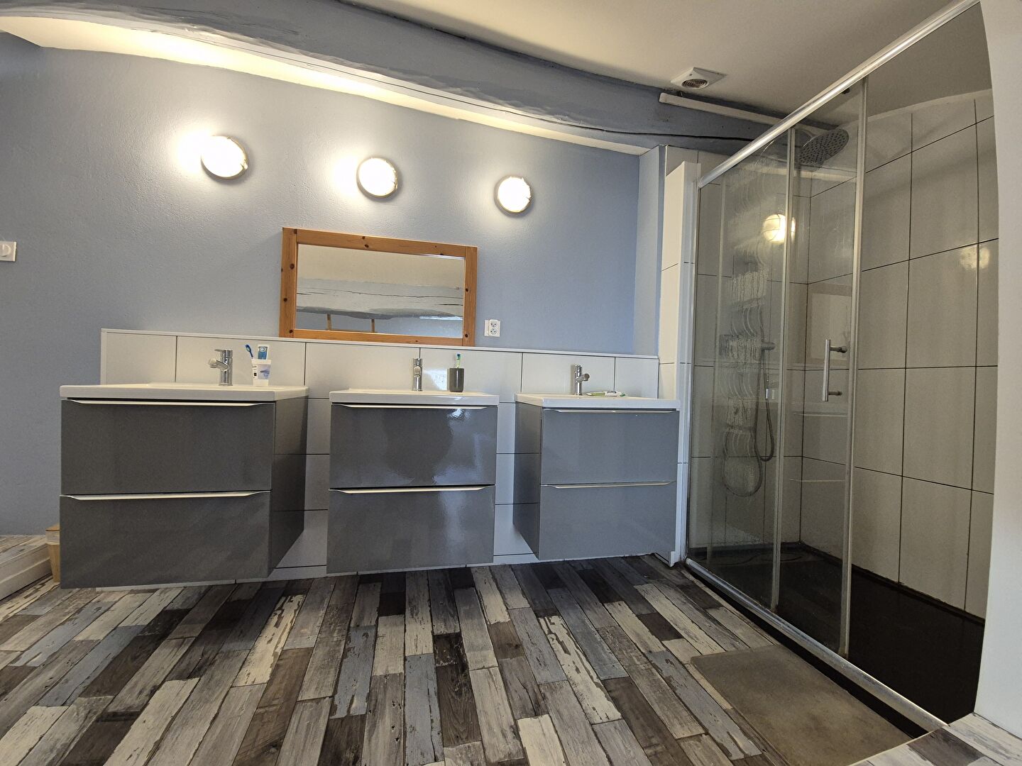 Une vaste salle d'eau familiale équipée d'une triple vasque et wc, pensée pour la tribu.
