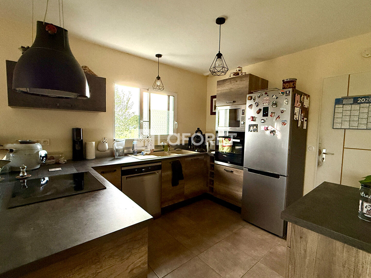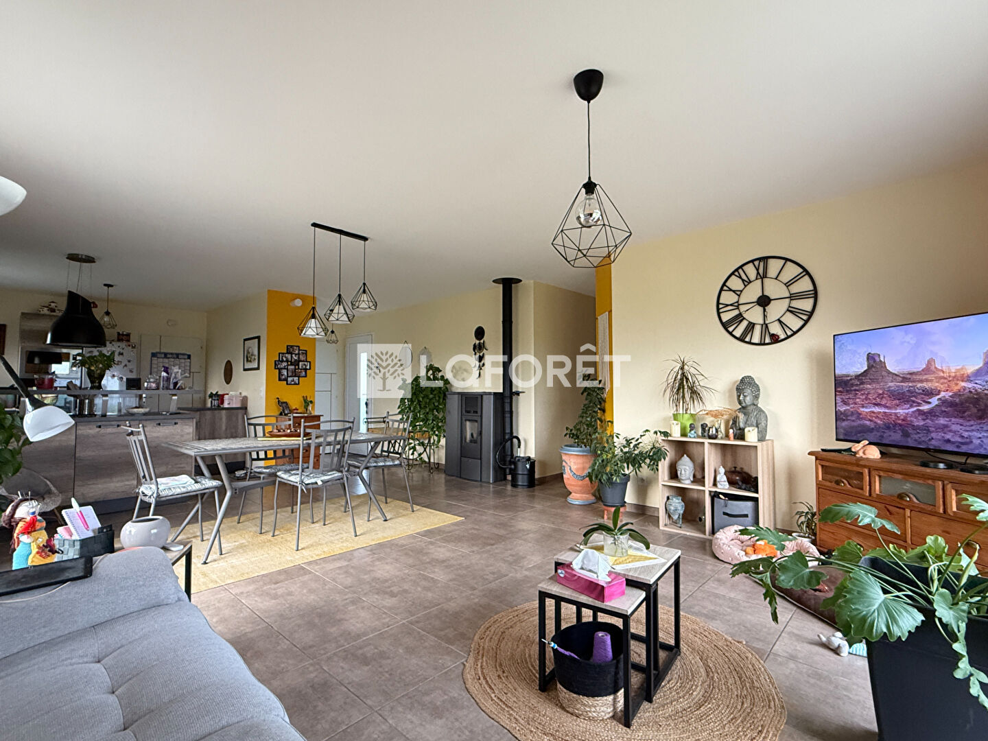 Lumineuse et bien agencée, elle propose une cuisine équipée et aménagée ouverte sur un spacieux salon séjour, créant un espace de vie agréable et convivial avec son poêle.