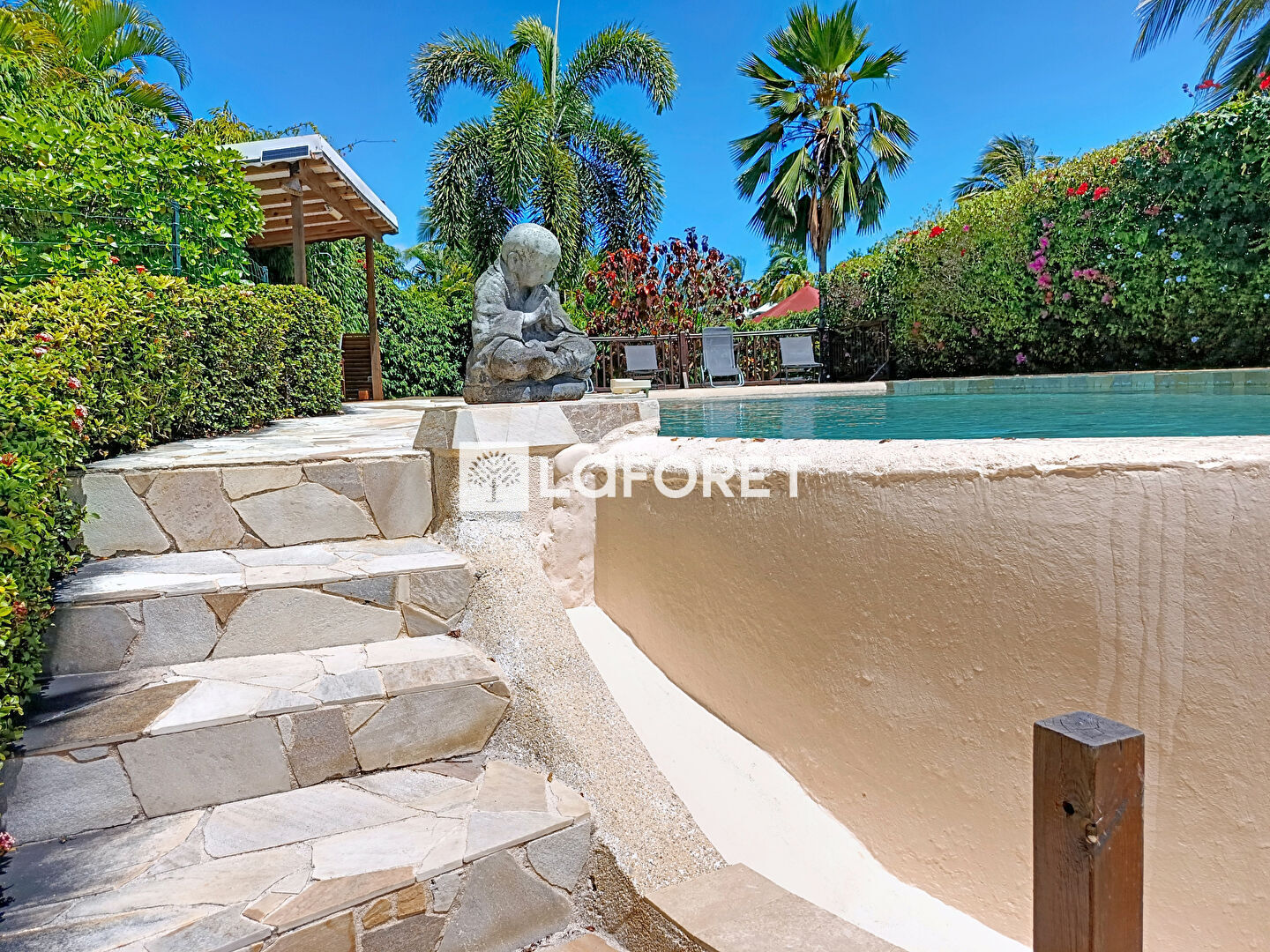 Un espace carbet permet de profiter pleinement de la piscine et de l'espace extérieur.