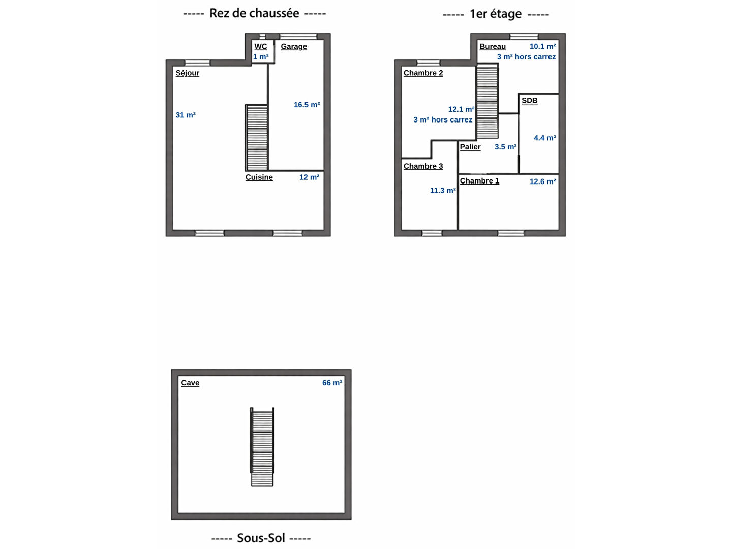 En sous-sol, la maison dispose d'un espace divisé en deux volumes de 35 m² et 30 m², idéaux pour le stockage, un atelier ou un espace complémentaire.