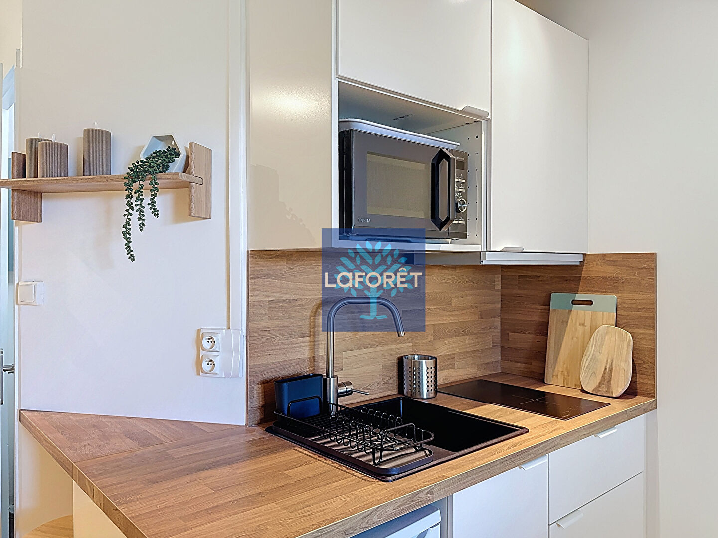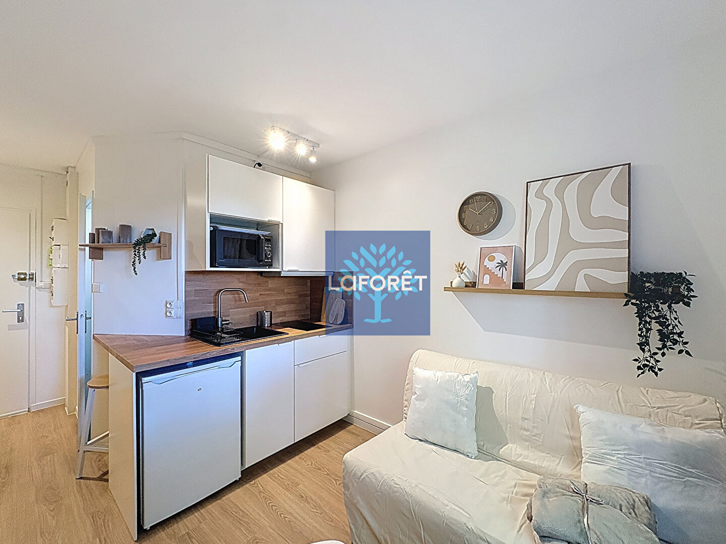 Le logement comprend une pièce principale lumineuse avec coin nuit et bureau, une kitchenette équipée (plaques, réfrigérateur, vaisselle, rangements) et une salle d'eau avec douche et WC.