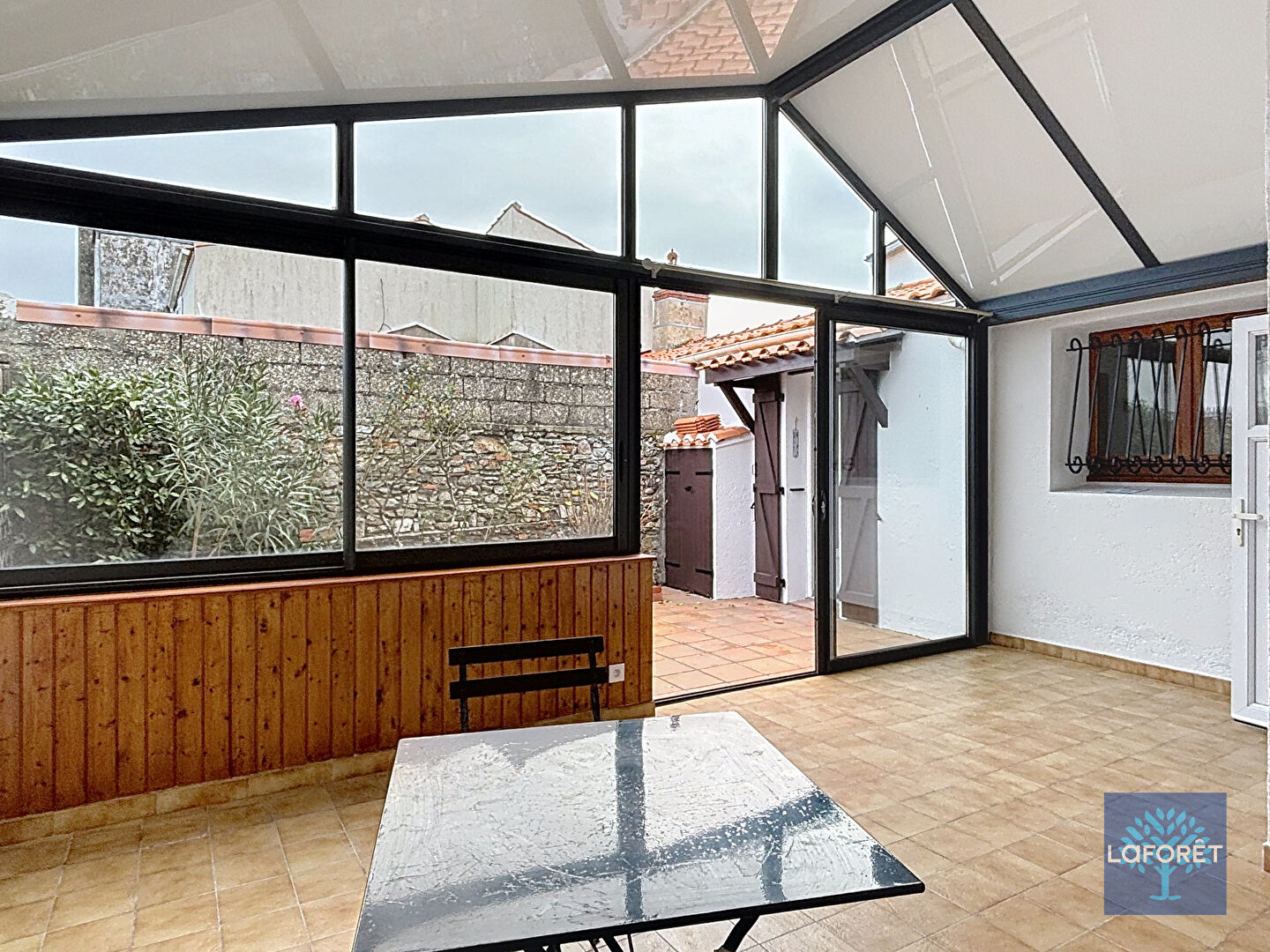 Une cour extérieure, mène à une spacieuse véranda contenant une buanderie.