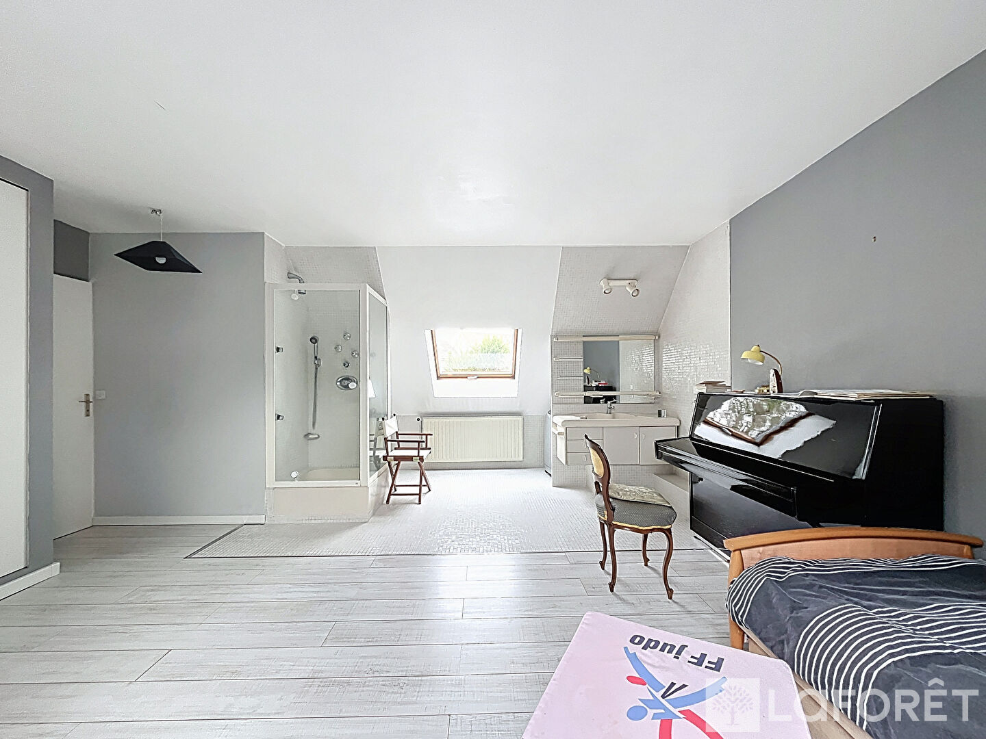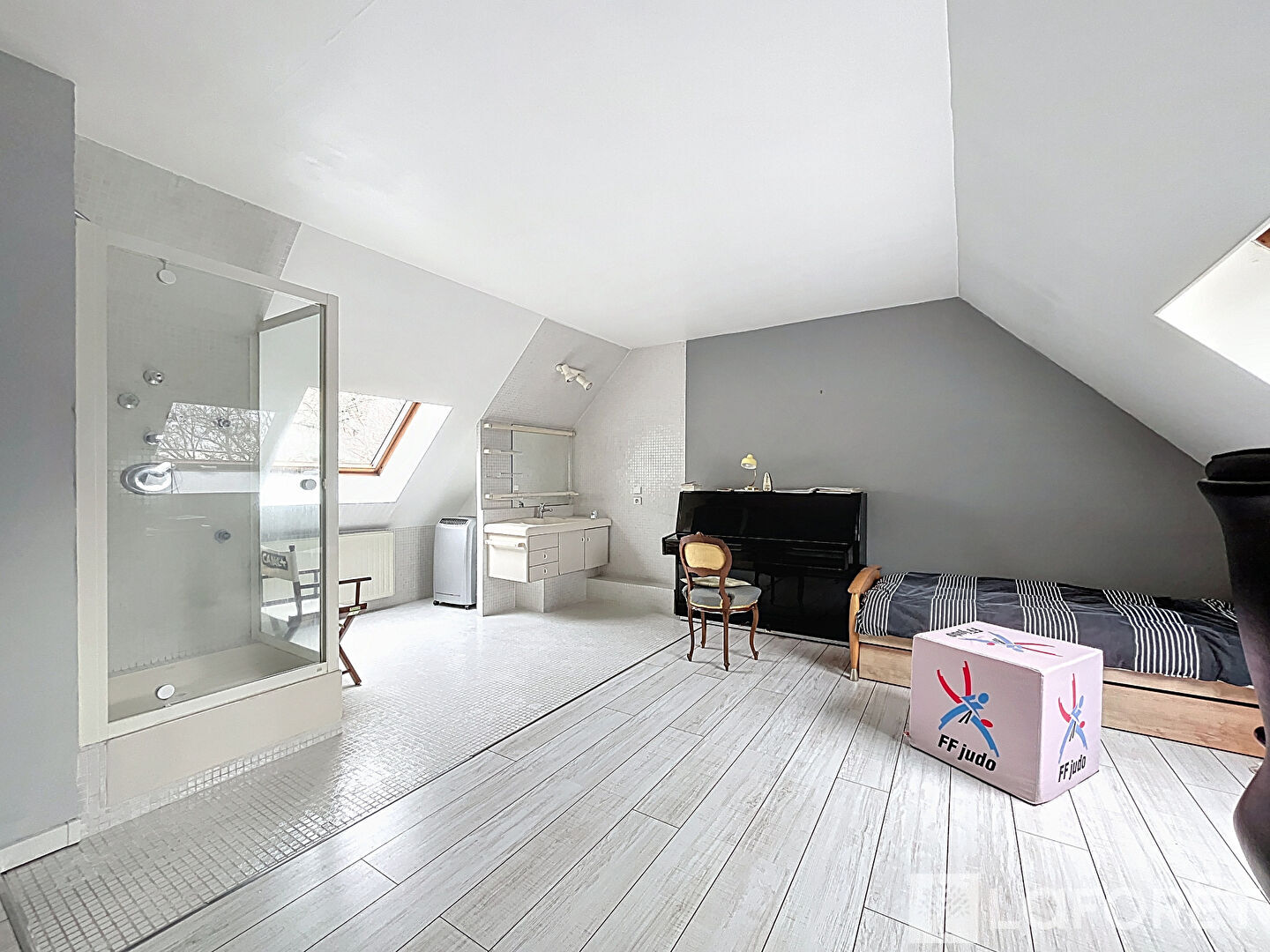 À l'étage, une mezzanine offre des possibilités variées, telle qu'une troisième chambre ou un bureau, agrémentée de toilettes séparés et d'une spacieuse chambre avec sa salle d'eau attenante. Là encore la sensation de grandeur est présente et surplombe le salon.