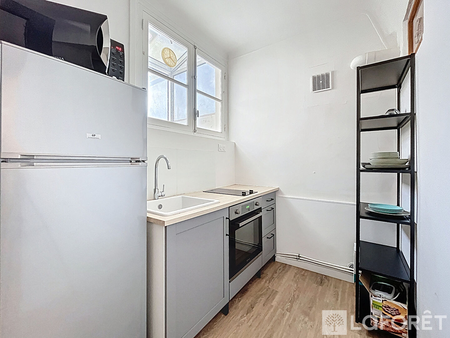 La cuisine est équipée d'un four traditionnel, d'un micro-onde et d'une plaque de cuisson.