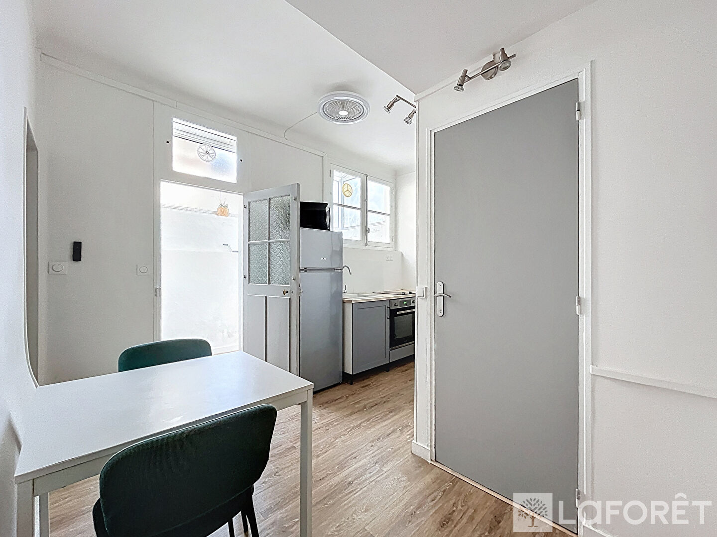 Il se compose d'un séjour avec canapé-lit et armoire, d'une grande cuisine fermée qui donne accès à une véranda et qui sert aussi de buanderie.