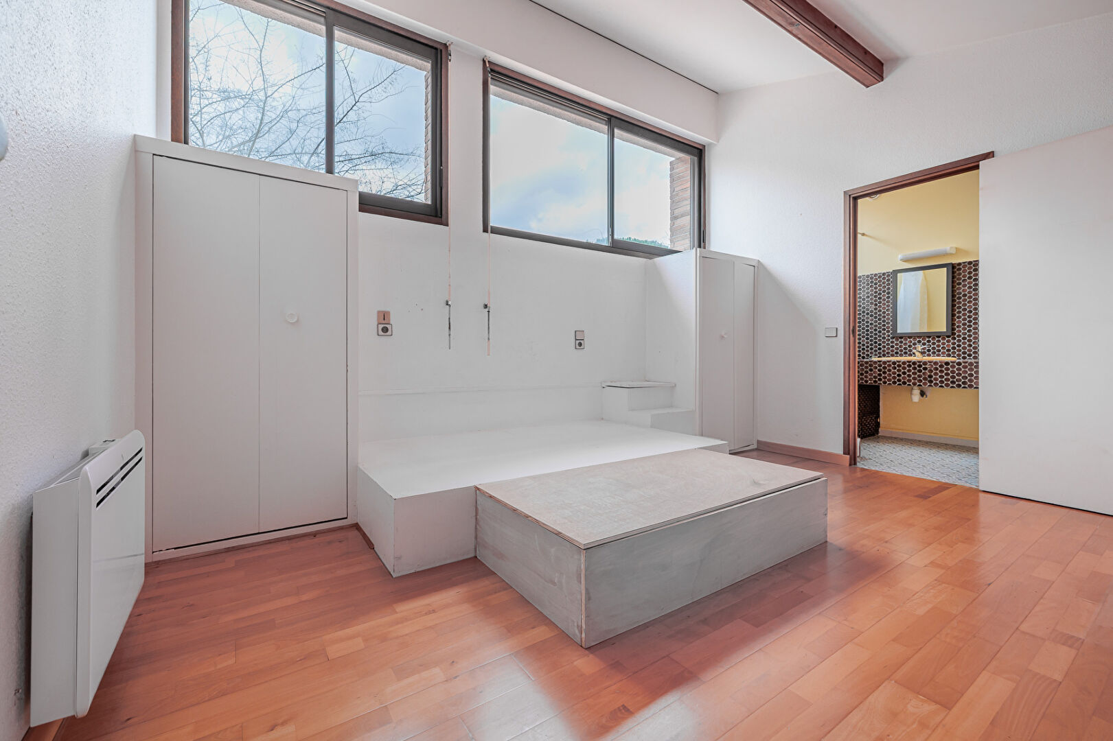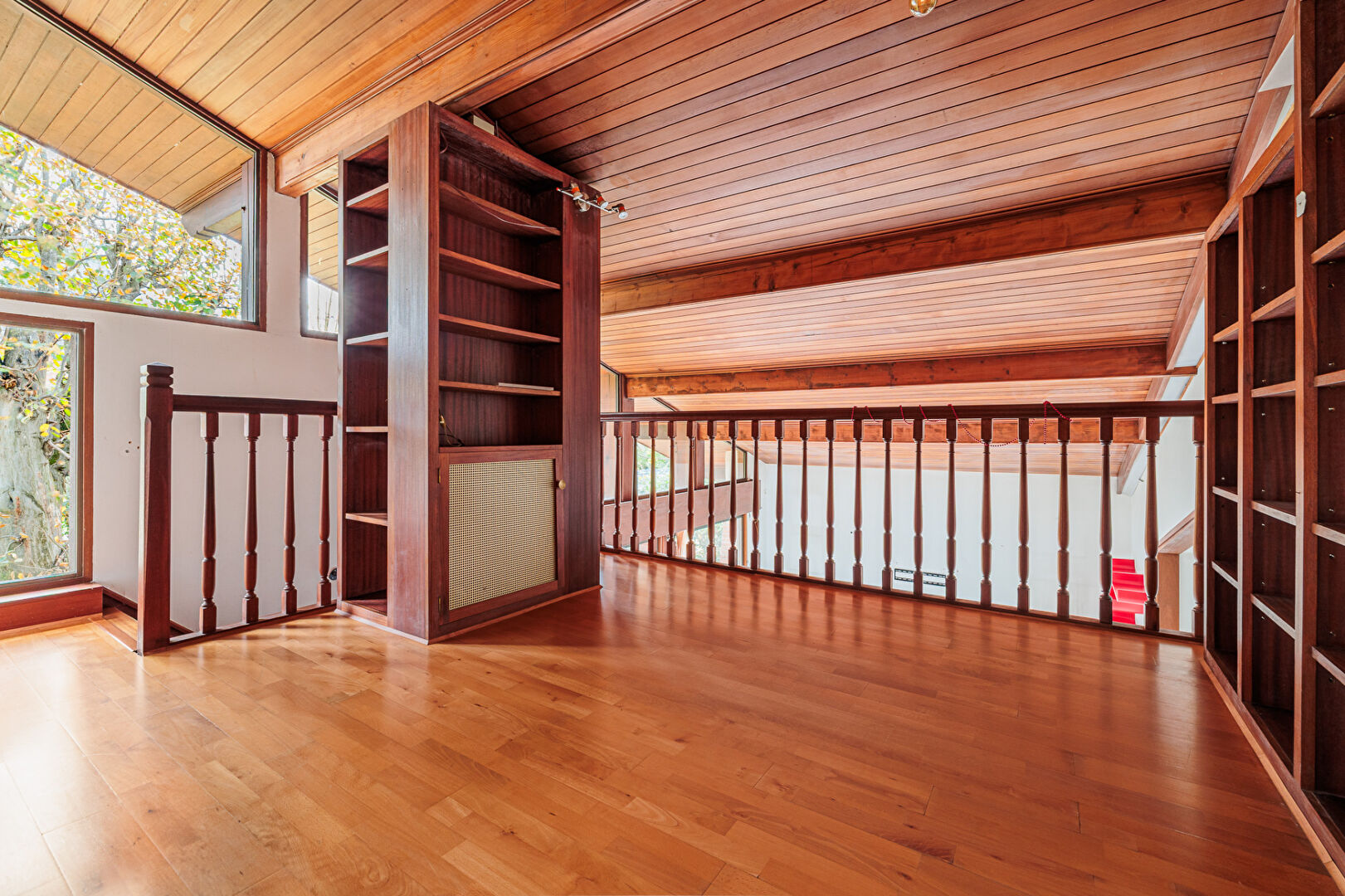 A l'étage vous trouverez un espace bibliothèque sur mesure avec vue sur le salon séjour, un bureau avec accès sur un balcon extérieur et une troisième chambre avec salle d'eau privative.