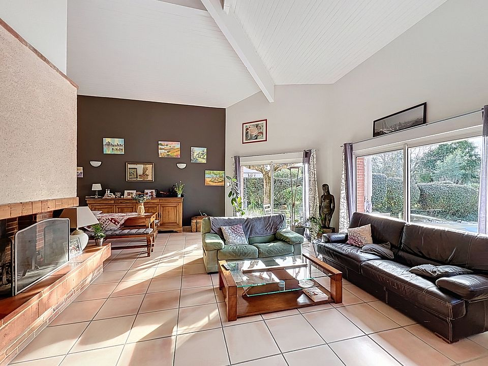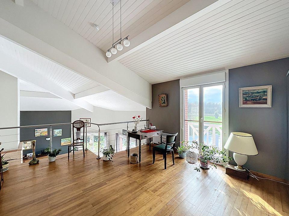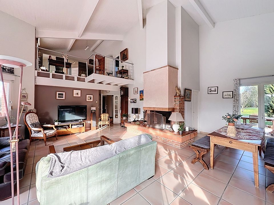 Cette maison de plus de 200m² se compose d'un double séjour cathédrale très lumineux avec ses baies vitrées, et d'un bureau attenant à une belle terrasse.