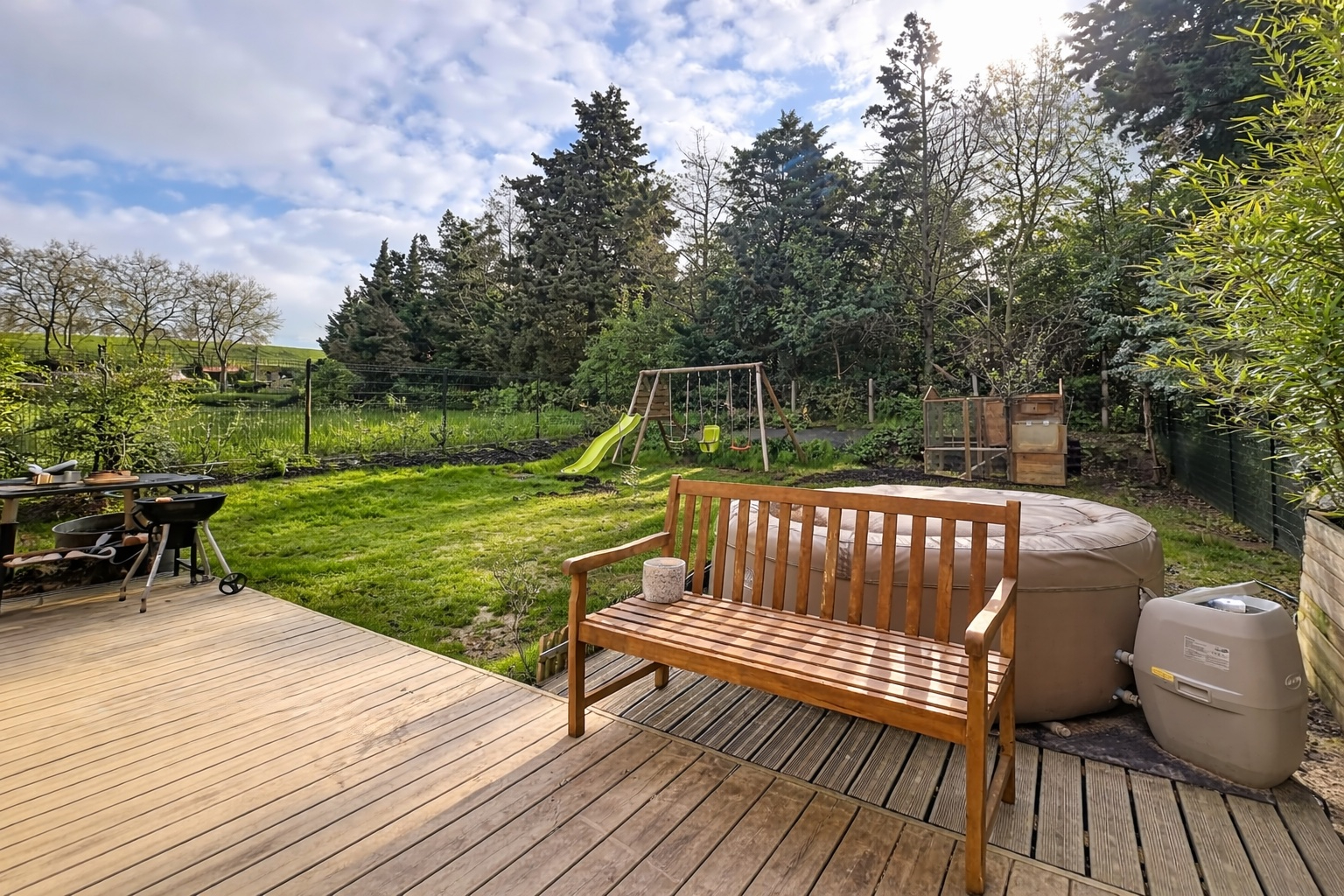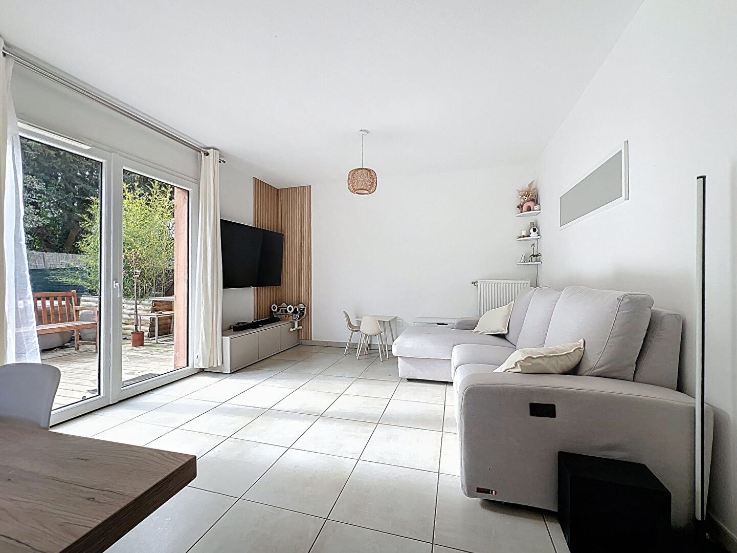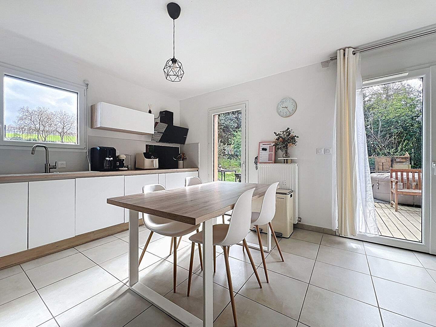 La pièce de vie offre un séjour lumineux et sans vis-à-vis, ouvert sur une cuisine équipée et moderne, le tout donnant sur une terrasse et son jardin.