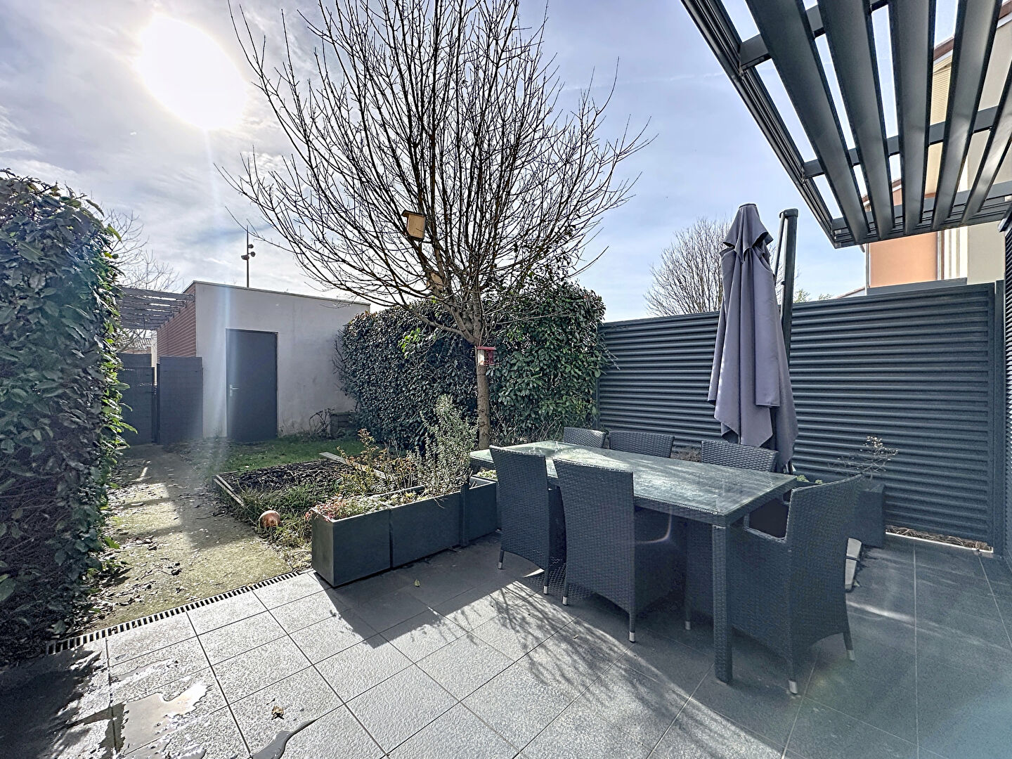 À l'extérieur, vous profiterez d'un jardin avec terrasse ainsi que d'un garage fermé et d'une place de stationnement attenante.