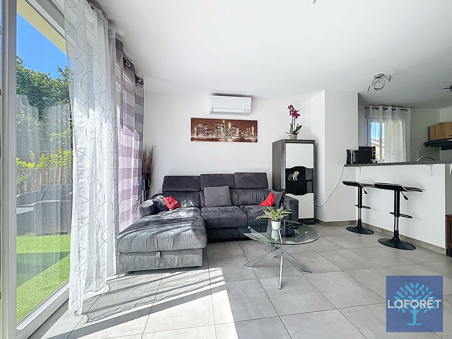 Elle se compose d' une entrée avec placard, un beau séjour lumineux, une cuisine aménagée ouverte sur le séjour, le tout donnant sur une agréable terrasse et son jardin.