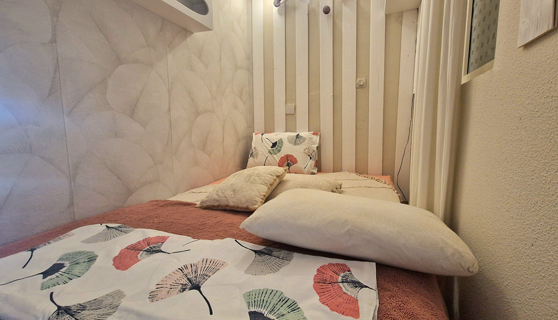 L'appartement se compose d'une petite chambre avec fenêtre, d'une salle d'eau avec WC, d'un séjour avec kitchenette ouvrant sur une belle terrasse ensoleillée et son jardin.