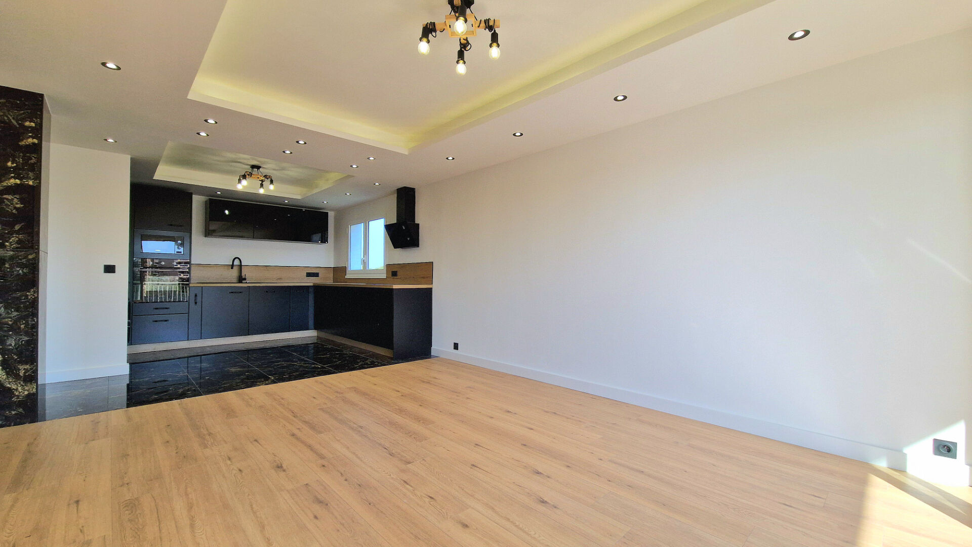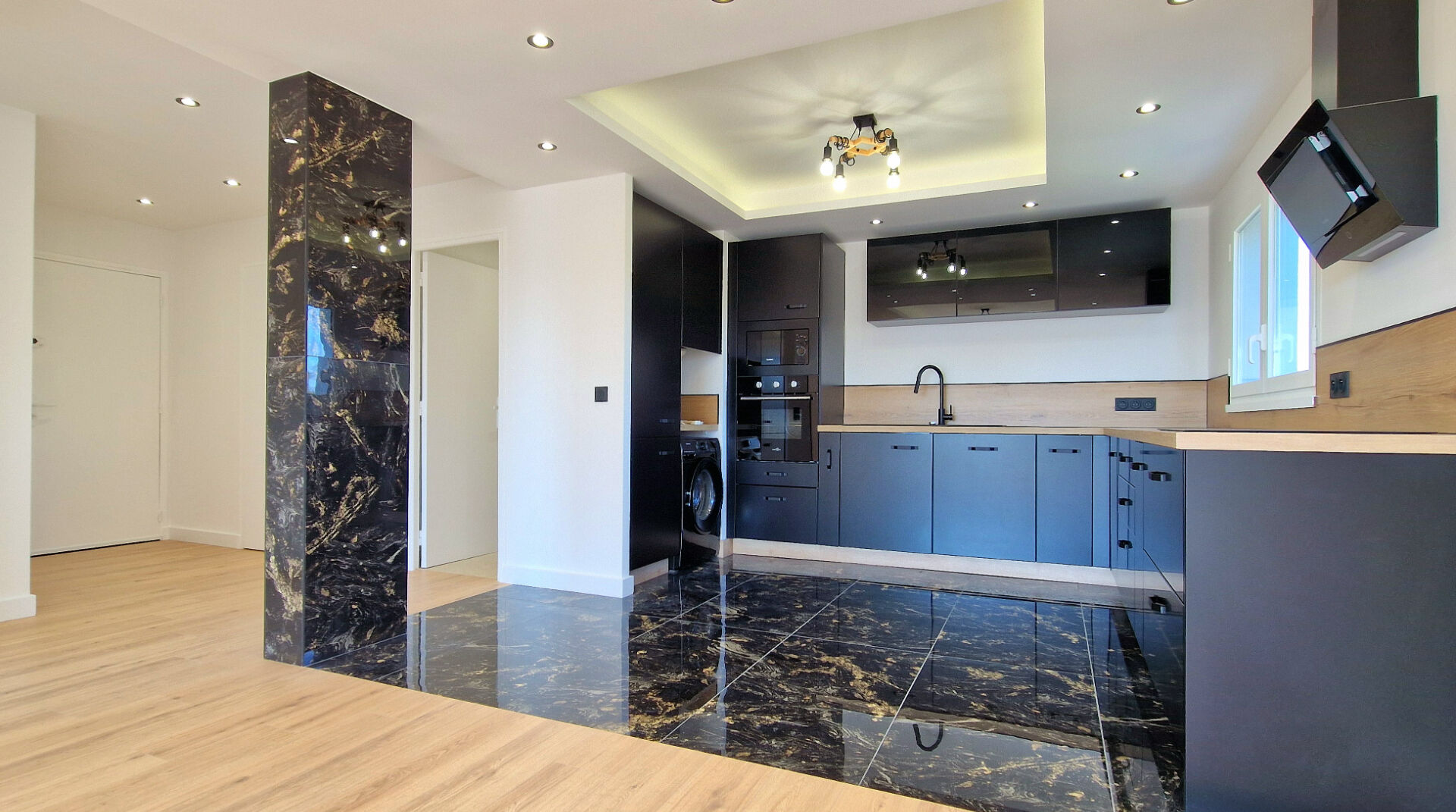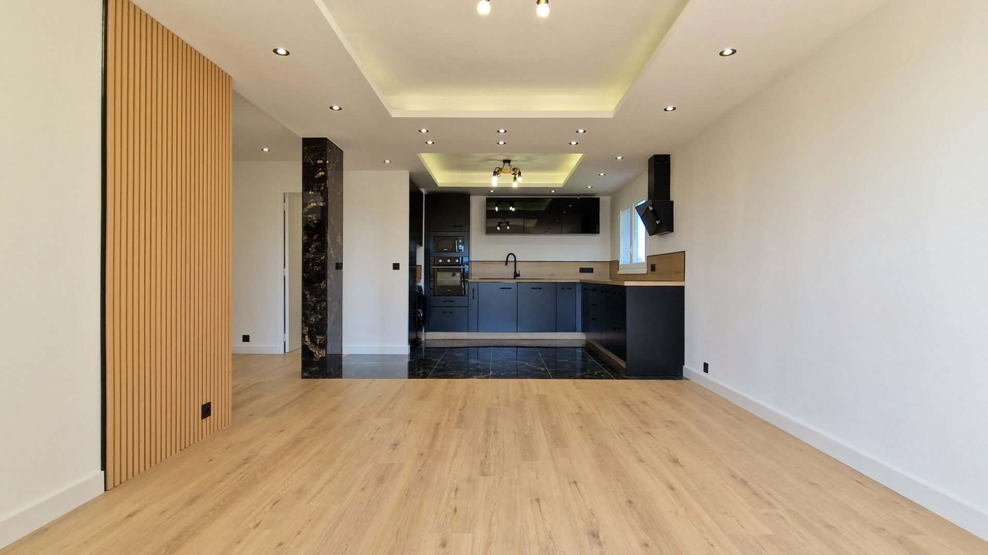 La cuisine, ouverte et élégamment intégrée, s'harmonise parfaitement avec le séjour, créant un lieu de vie aussi convivial que contemporain, tourné vers l'extérieur.