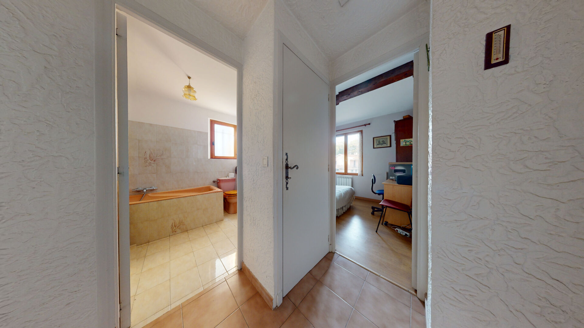 - A l'étage : un palier désservant 3 chambres dont 1 suite parentale avec douche, une salle de bains avec un wc.