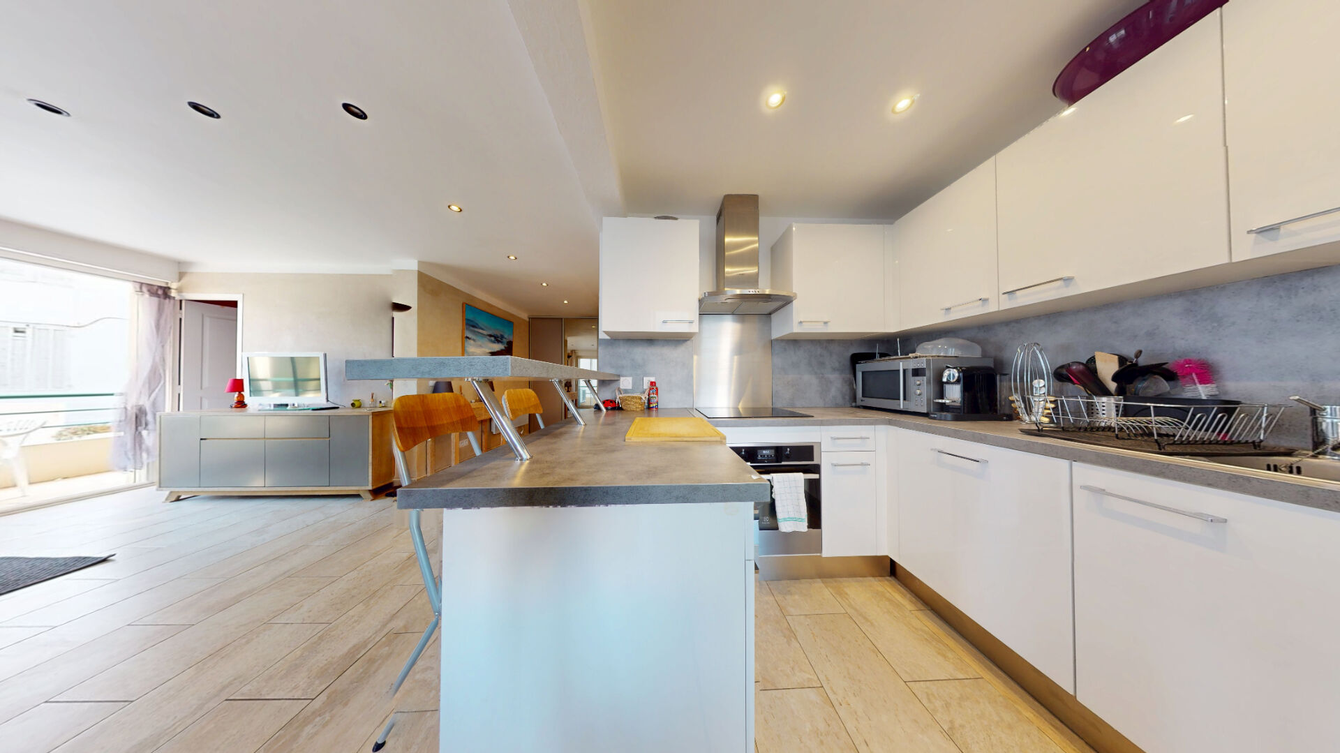 Une cuisine ouverte contemporaine, élégamment aménagée et entièrement équipée.