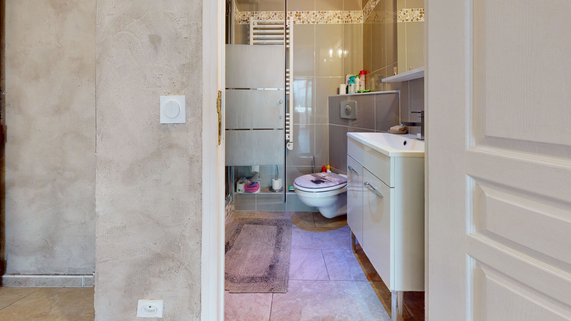 Une salle d'eau raffinée, aux finitions modernes, avec douche et toilettes intégrées.