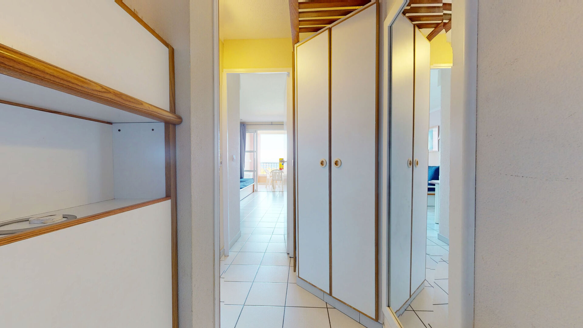 Il se compose d'un coin cabine avec lits superposés, d'une salle de bain avec WC, d'un séjour avec kitchenette toute équipée et deux couchages, le tout donnant sur une belle terrasse couverte ensoleillée. Possibilité de coucher jusqu'à 5 personnes. L'appartement est vendu intégralement meublé avec une place de parking couverte en sous sol.
