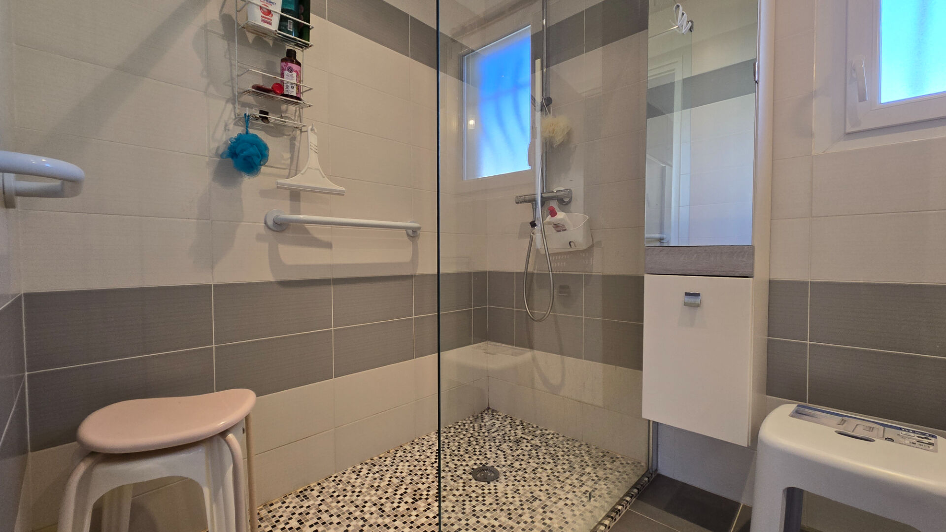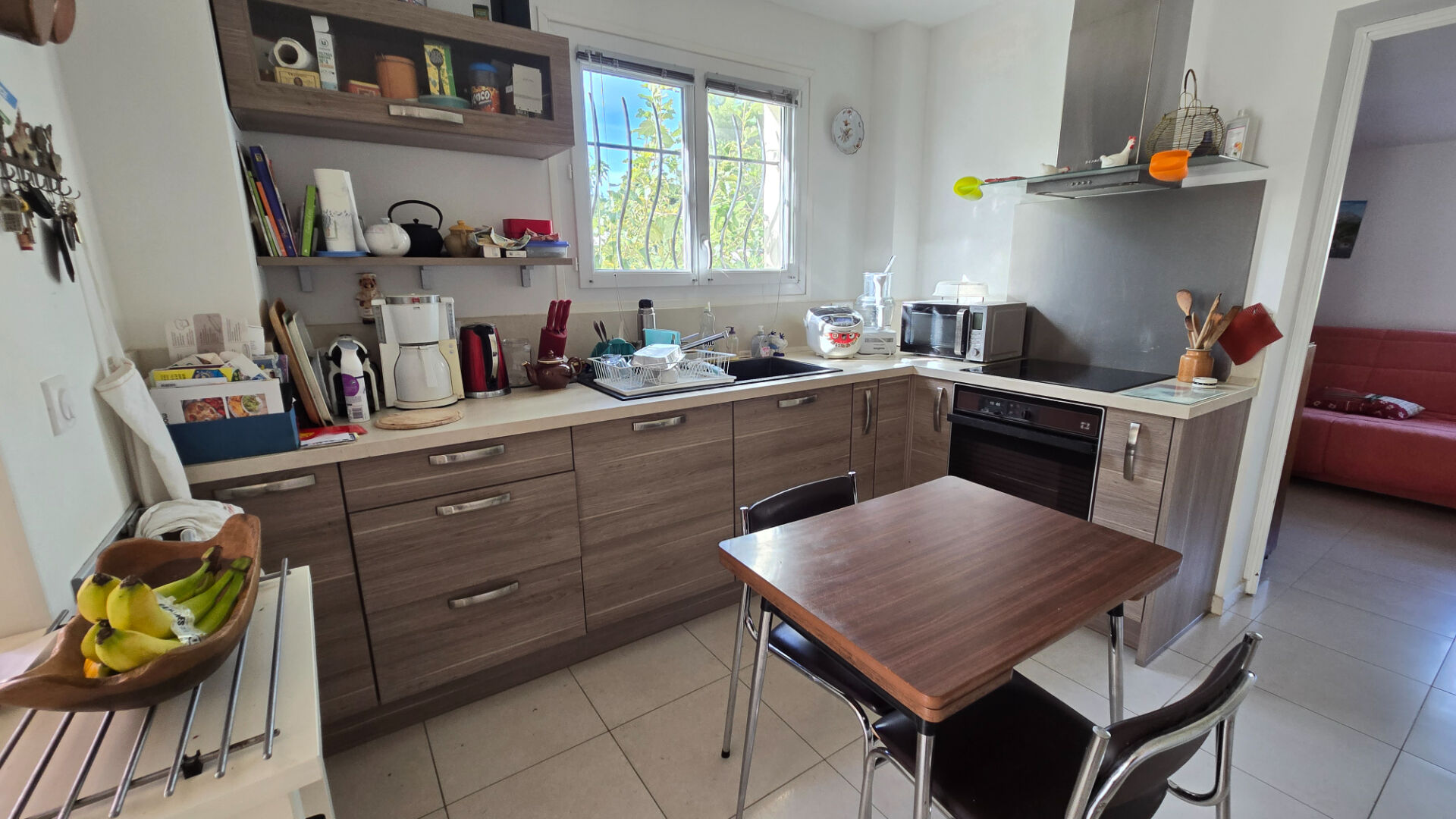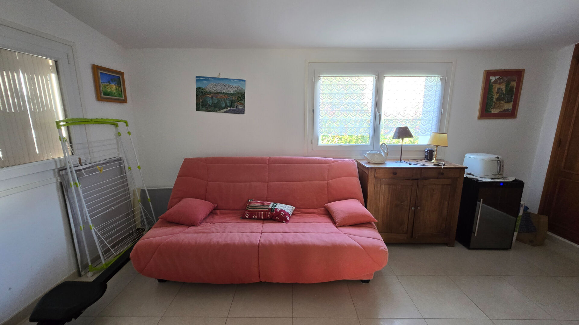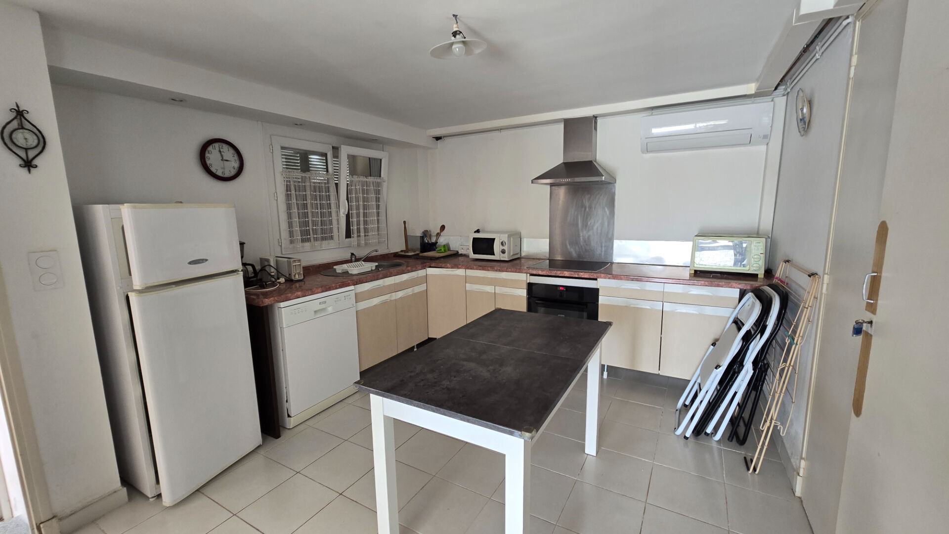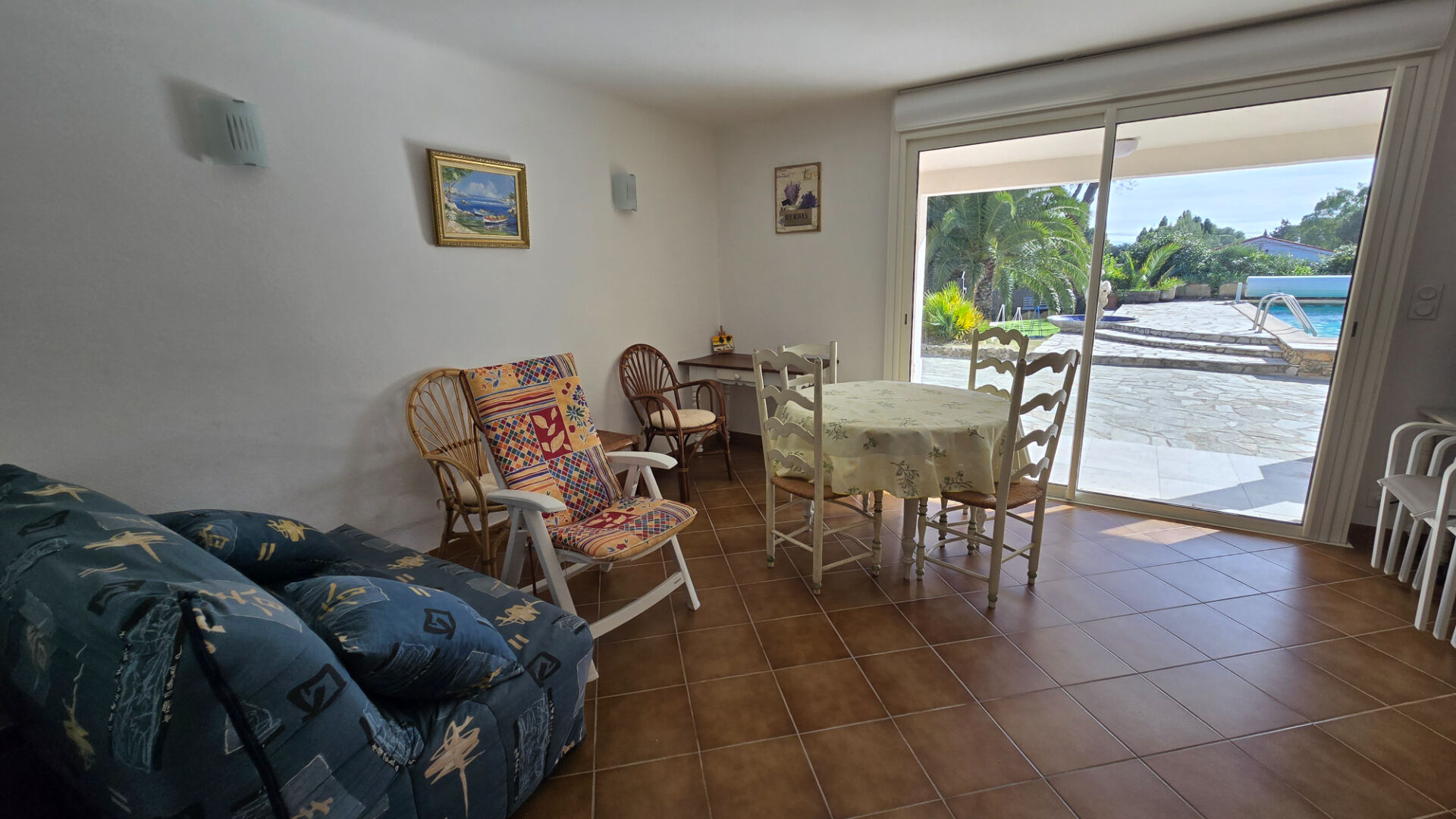 Au rez-de-chaussée, un appartement deux pièces comprenant une cuisine entièrement équipée, un salon, une chambre séparée, une salle d'eau et un WC, le tout ouvert sur une terrasse ensoleillée avec accès direct à la piscine (5 x 9 m, au chlore).