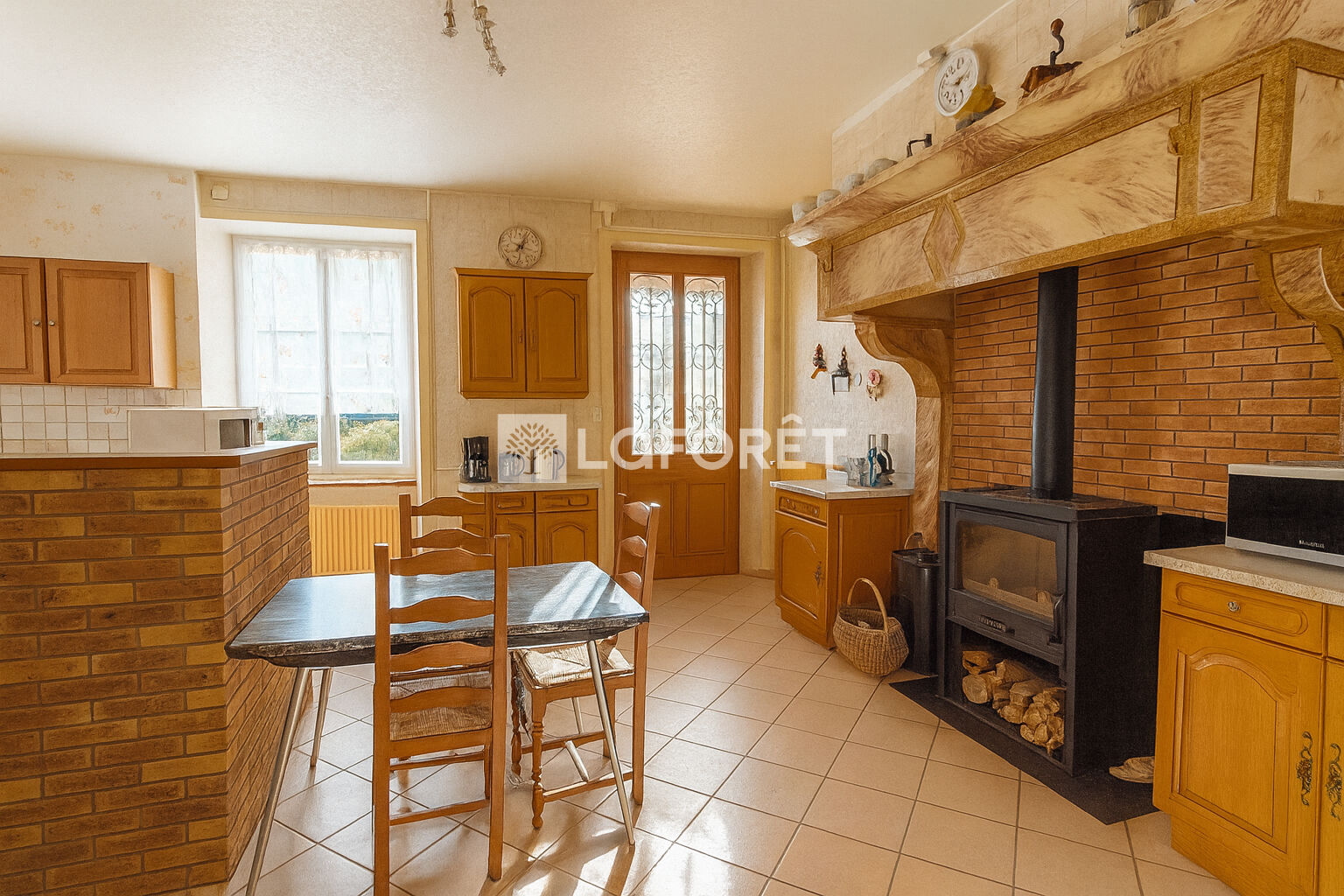 La maison est chauffée par une pompe à chaleur et un insert. Les menuiseries sont en double vitrage.