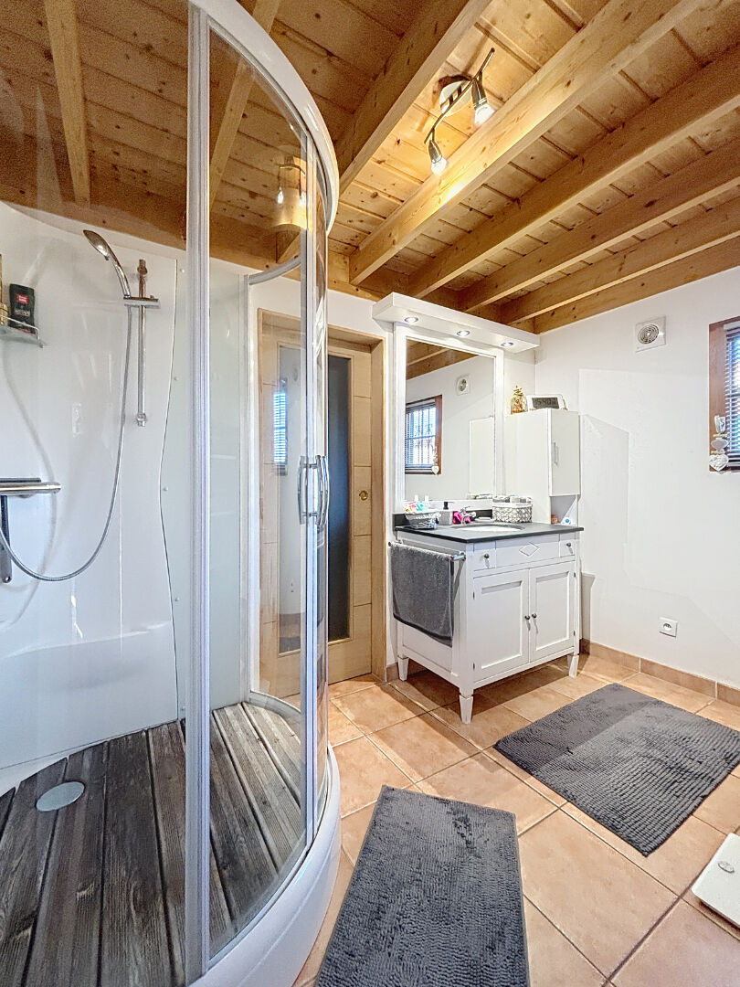 Le coeur de la maison s'articule autour d'une belle pièce de vie avec cuisine ouverte, prolongée par une véranda de 24 m², véritable extension de l'espace de vie, idéale en toute saison. Une salle d'eau avec dressing complète le RDC.