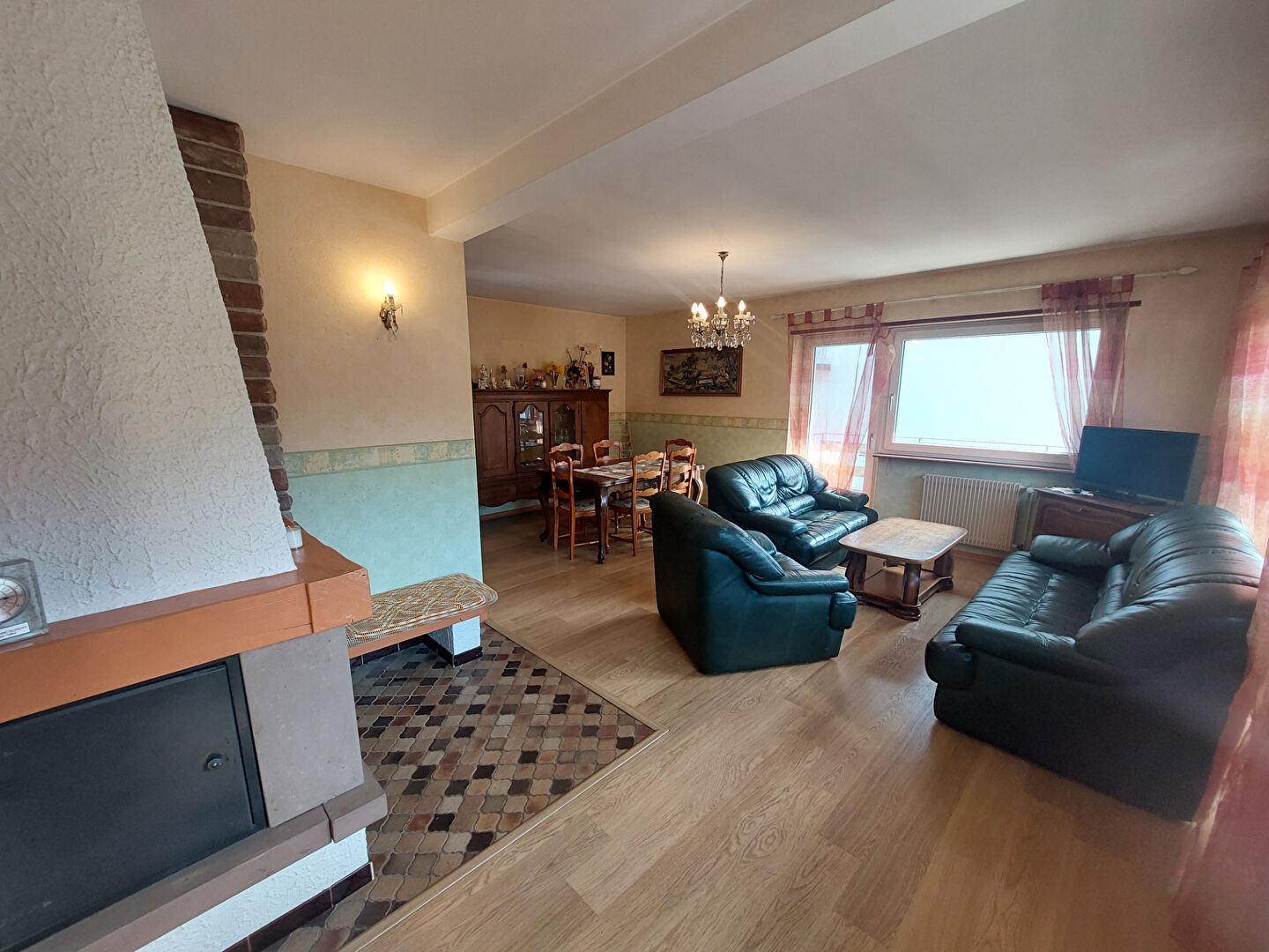 Un séjour / salle à manger chaleureux avec cheminée