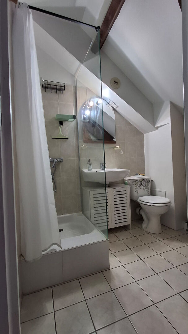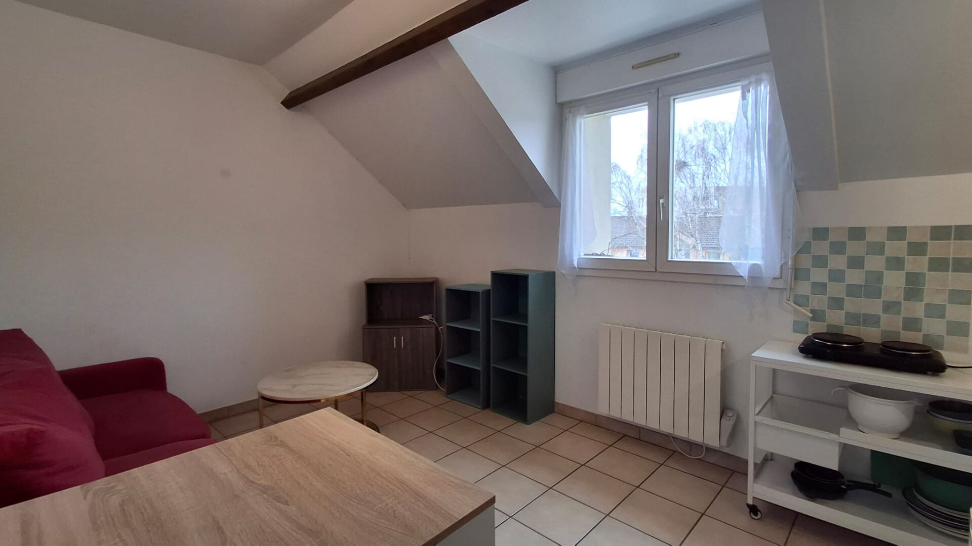 Pièce de vie avec kitchenette (incluant lave-linge), 1 belle chambre avec bureau et salle d'eau séparée.