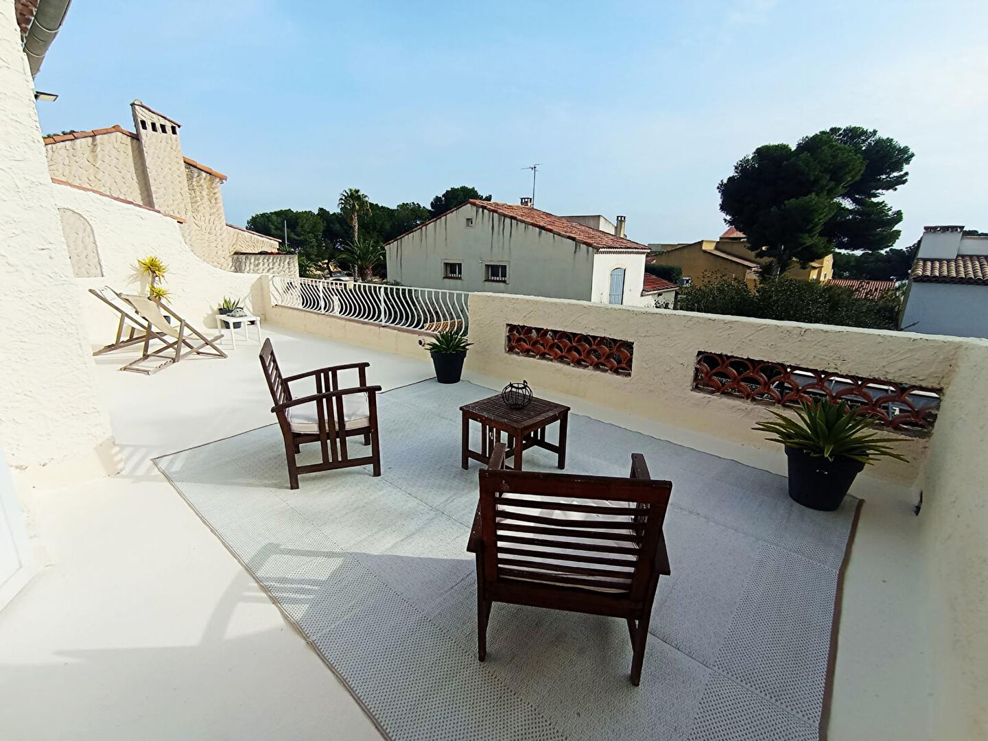 Le véritable atout charme : un grand solarium depuis lequel vous apercevez la mer, parfait pour profiter des fins de journée en toute intimité.