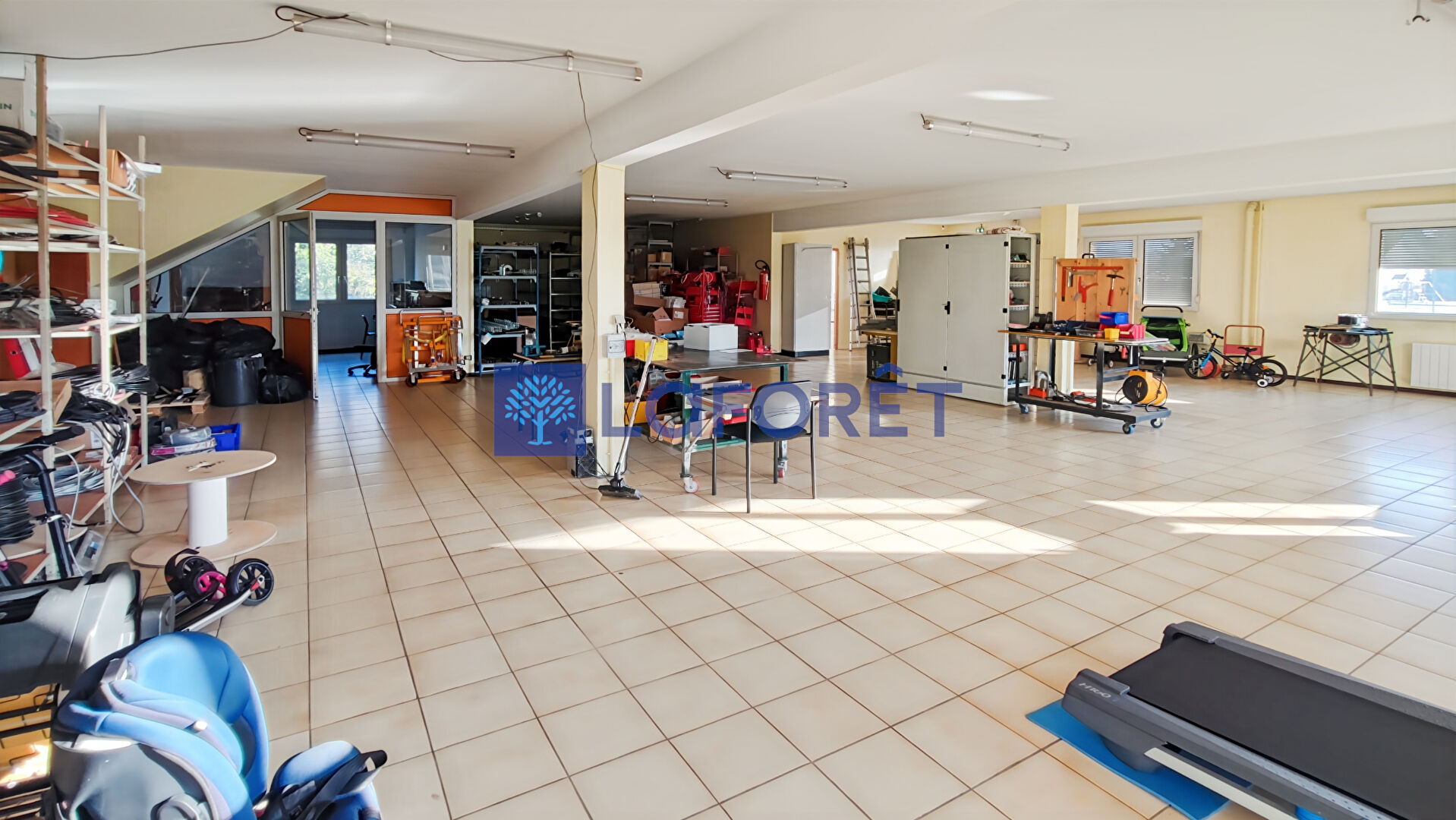 La partie professionnelle au rez-de-chaussée est composée d'un grand atelier de 173 m², de sanitaires, de bureaux et d'un espace cuisine.