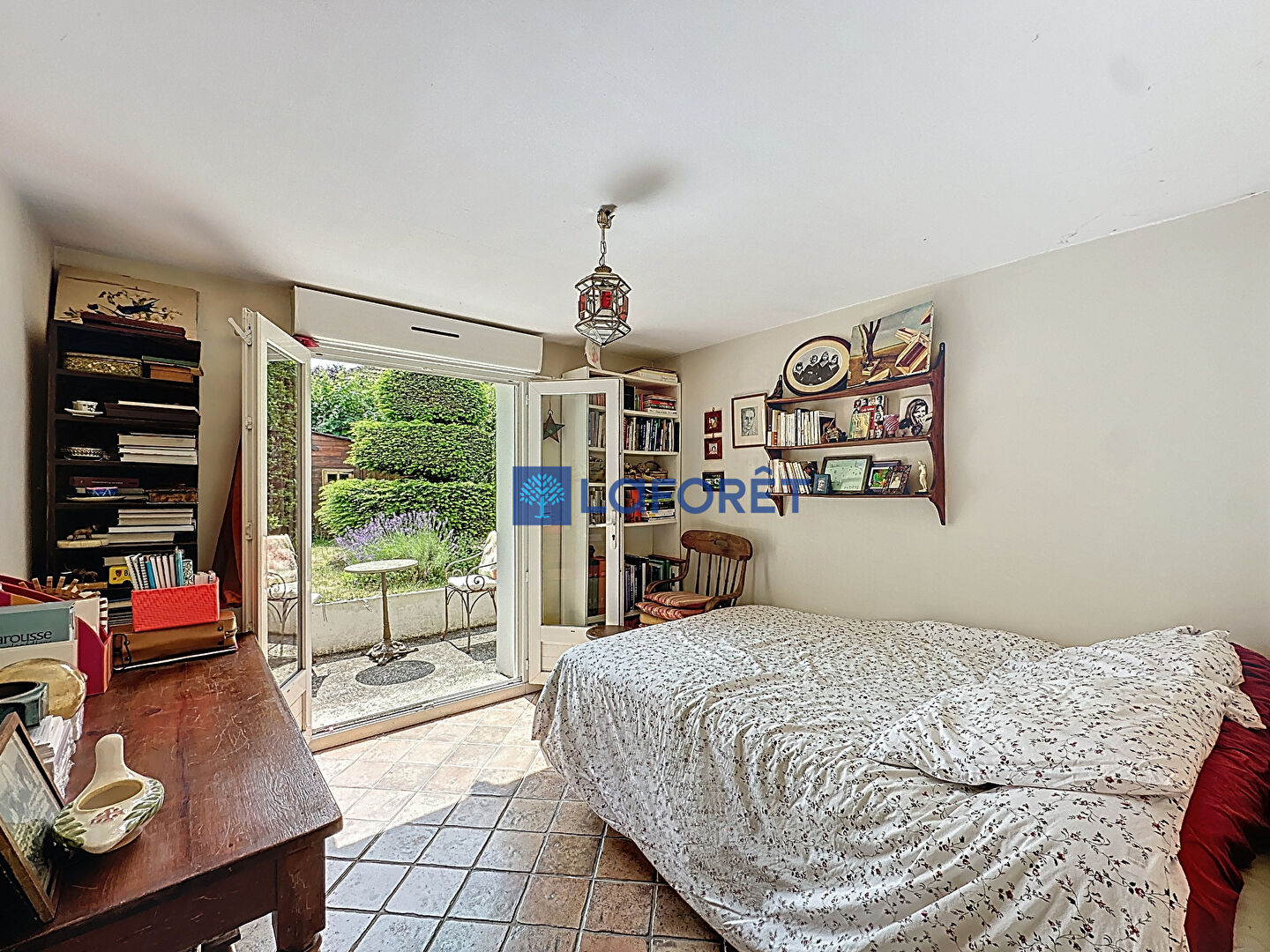 Au rez-de-jardin: une cuisine d'été reconvertie en bureau, une chambre spacieuse et lumineuse. Ces deux pièces ont un accès direct au jardin et à la terrasse ensoleillée à l'allure provençale bordée de romarin.