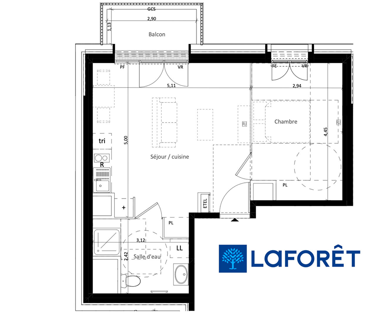 Il se compose d'une entrée desservant un séjour lumineux avec balcon, une chambre et une salle d'eau.