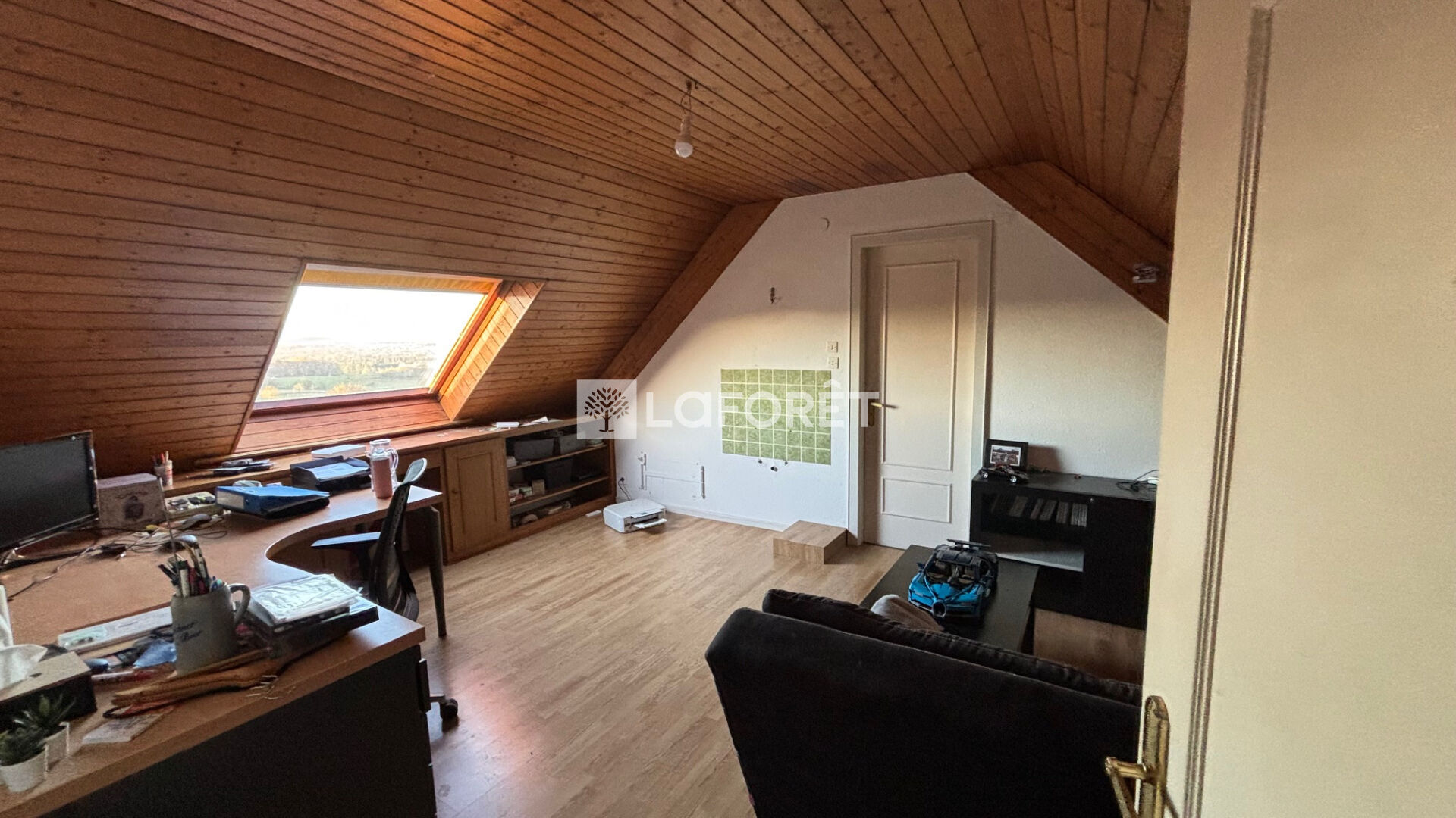 En montant au premier étage, vous accédez à une grande pièce de vie lumineuse, ouverte sur la cuisine, ainsi qu'une salle de bain, une chambre et un bureau.