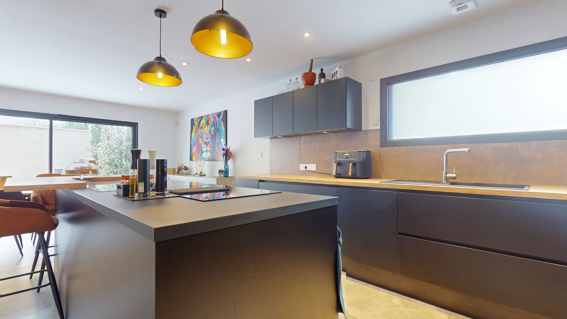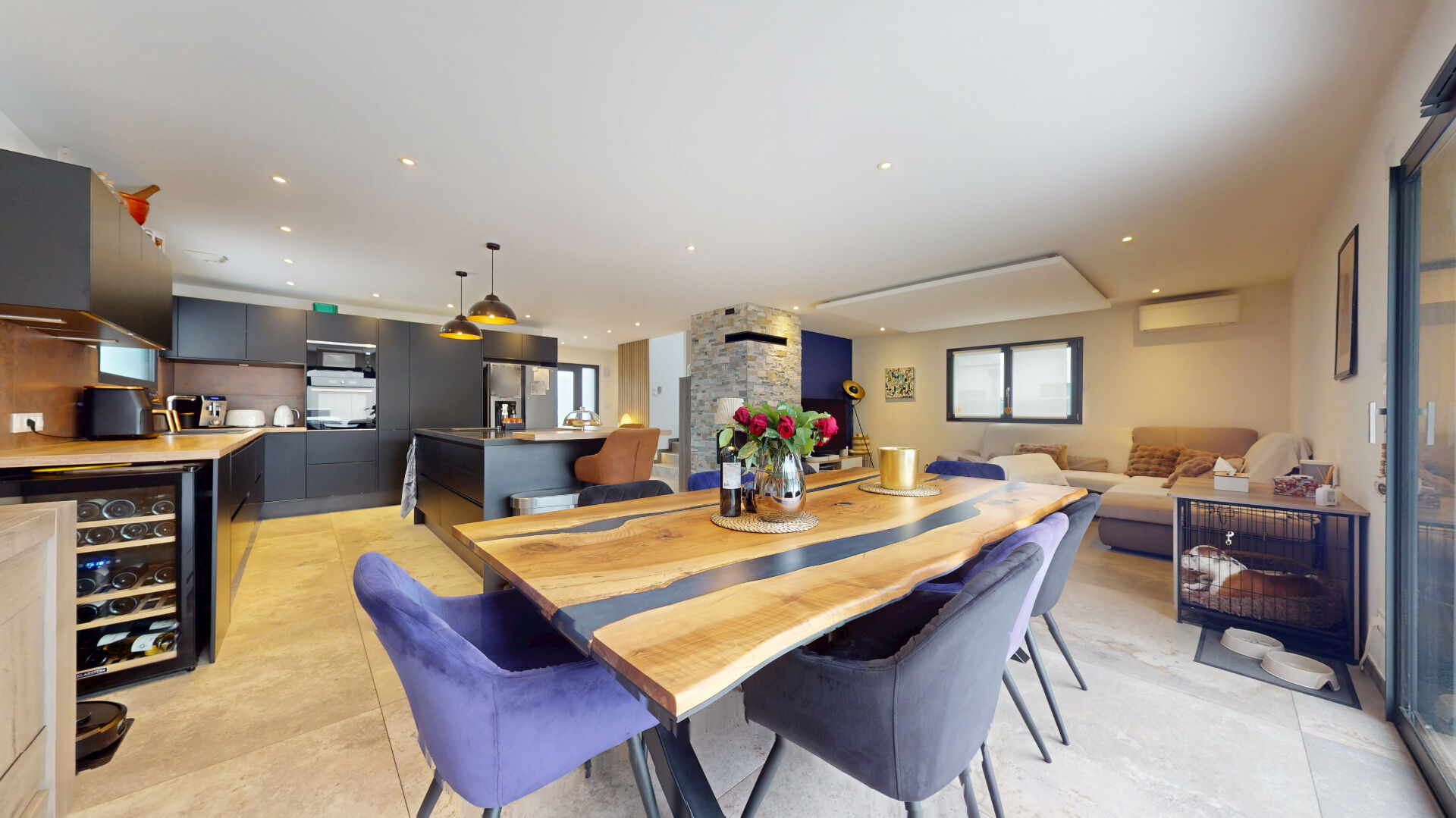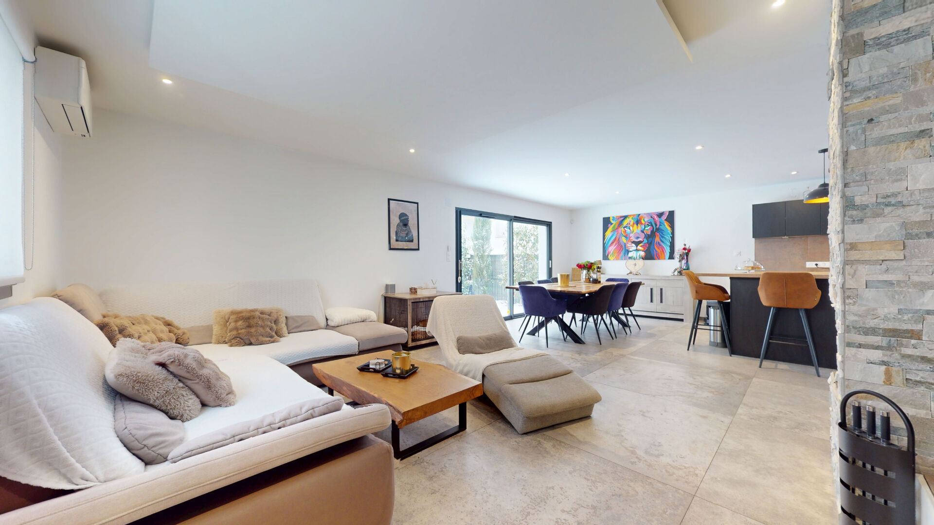 La pièce de vie, d'environ 60 m², offre un espace spectaculaire baigné de lumière, composé d'un séjour élégant et d'une cuisine ouverte aux lignes contemporaines. De larges baies vitrées assurent une continuité parfaite entre l'intérieur et l'extérieur, donnant accès à une terrasse et à une piscine chauffée de 7 m x 3 m, véritable invitation à la détente. Une cheminée vitrée d'angle vient sublimer l'ensemble et créer une atmosphère chaleureuse et raffinée.