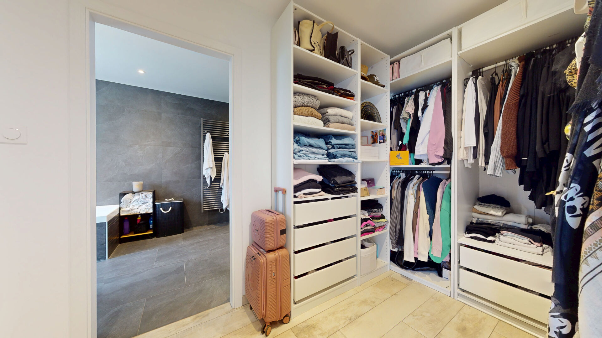 Une suite parentale d'exception avec dressing sur mesure et salle de bains privative, équipée d'une douche à l'italienne, d'une baignoire et d'une double vasque,