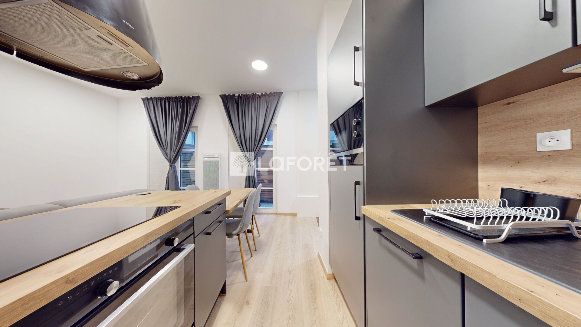 Vous disposez : d'une entrée, d'une cuisine aménagée et équipée (four, plaques, hotte, réfrigérateur, lave vaisselle), ouverte sur le séjour avec accès à une terrasse privative de 25m².