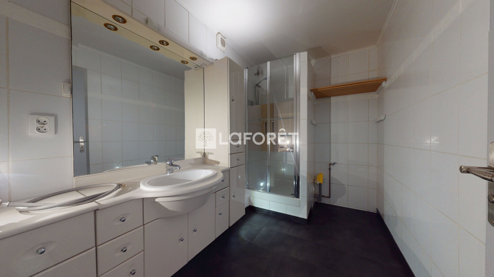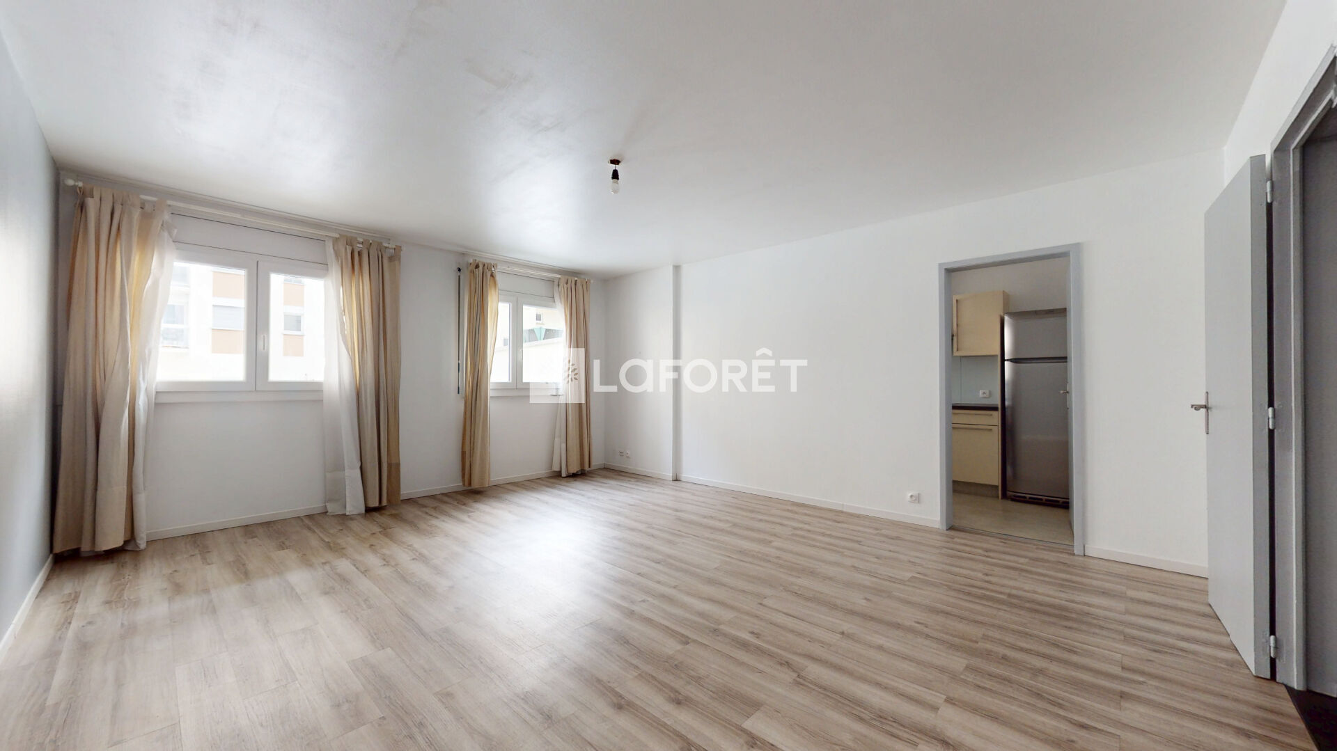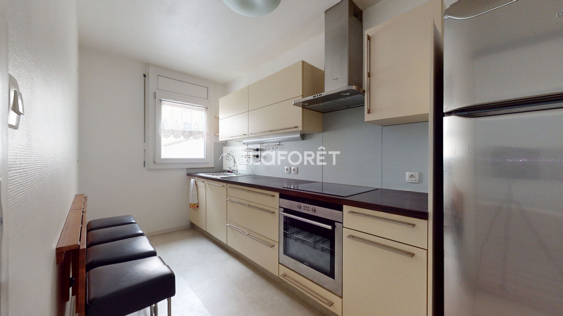 L'appartement se compose d'une entrée équipée d'un grand placard de rangement, d'un séjour lumineux de 25 m², d'une cuisine indépendante aménagée et entièrement équipée (réfrigérateur, four, plaques électriques, hotte, lave-vaisselle, nombreux rangements, table et tabourets).