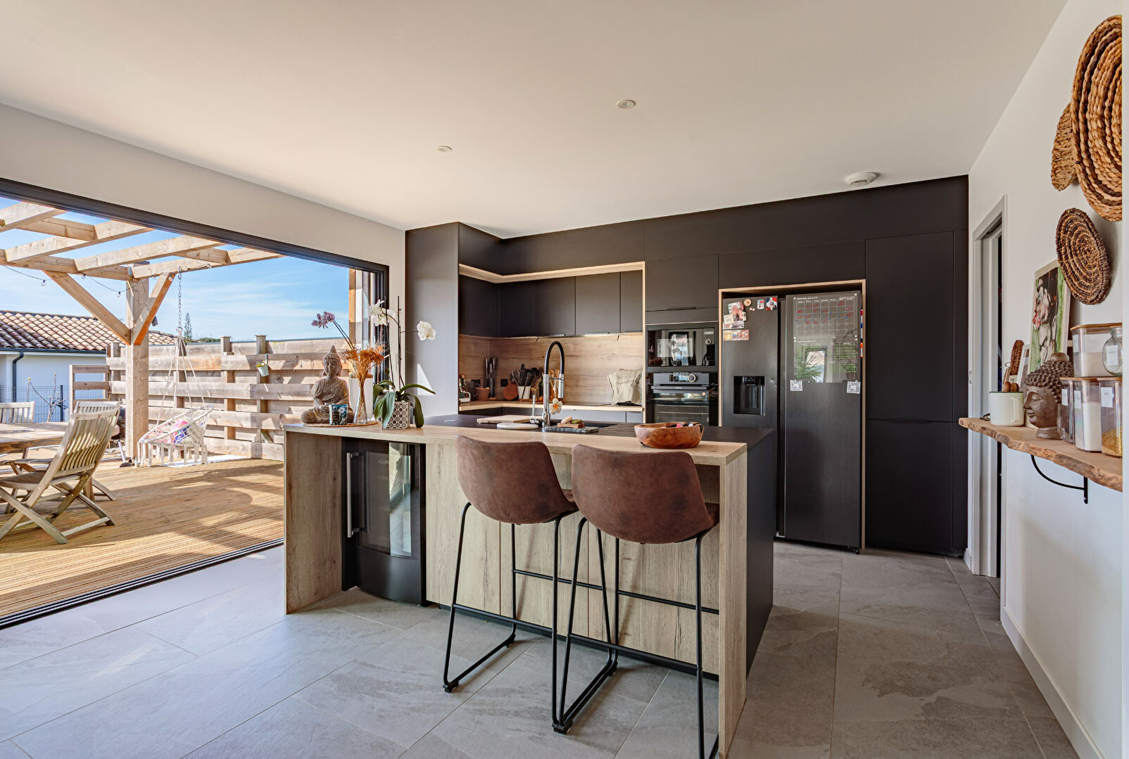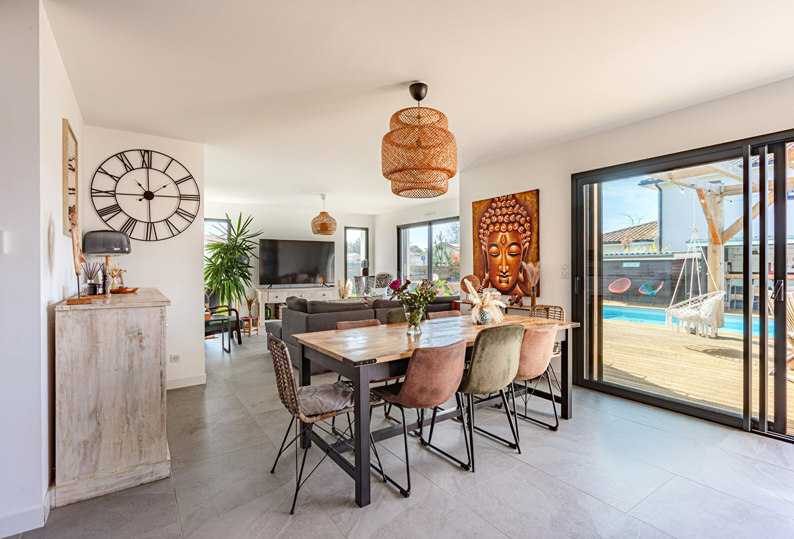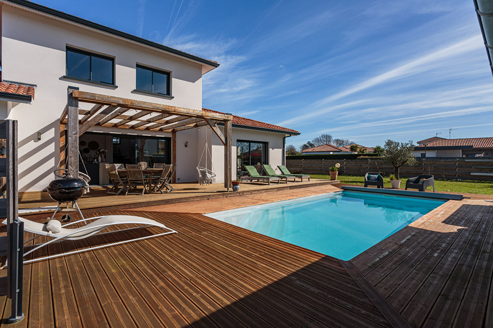 Dès l'entrée, la maison dévoile une vaste pièce de vie de plus de 50 m2 baignée de lumière, ouverte sur les terrasses, la piscine et le jardin. La cuisine contemporaine entièrement équipée, aux lignes élégantes, s'intègre harmonieusement à cet espace convivial pensé pour recevoir.