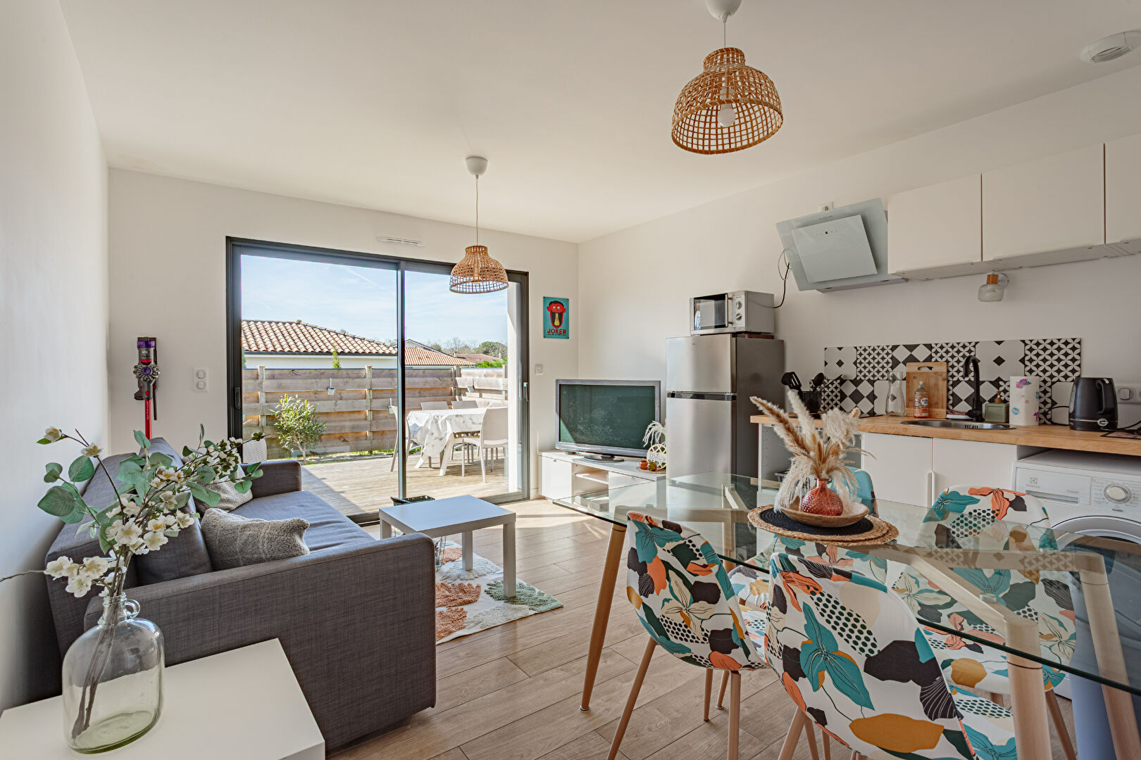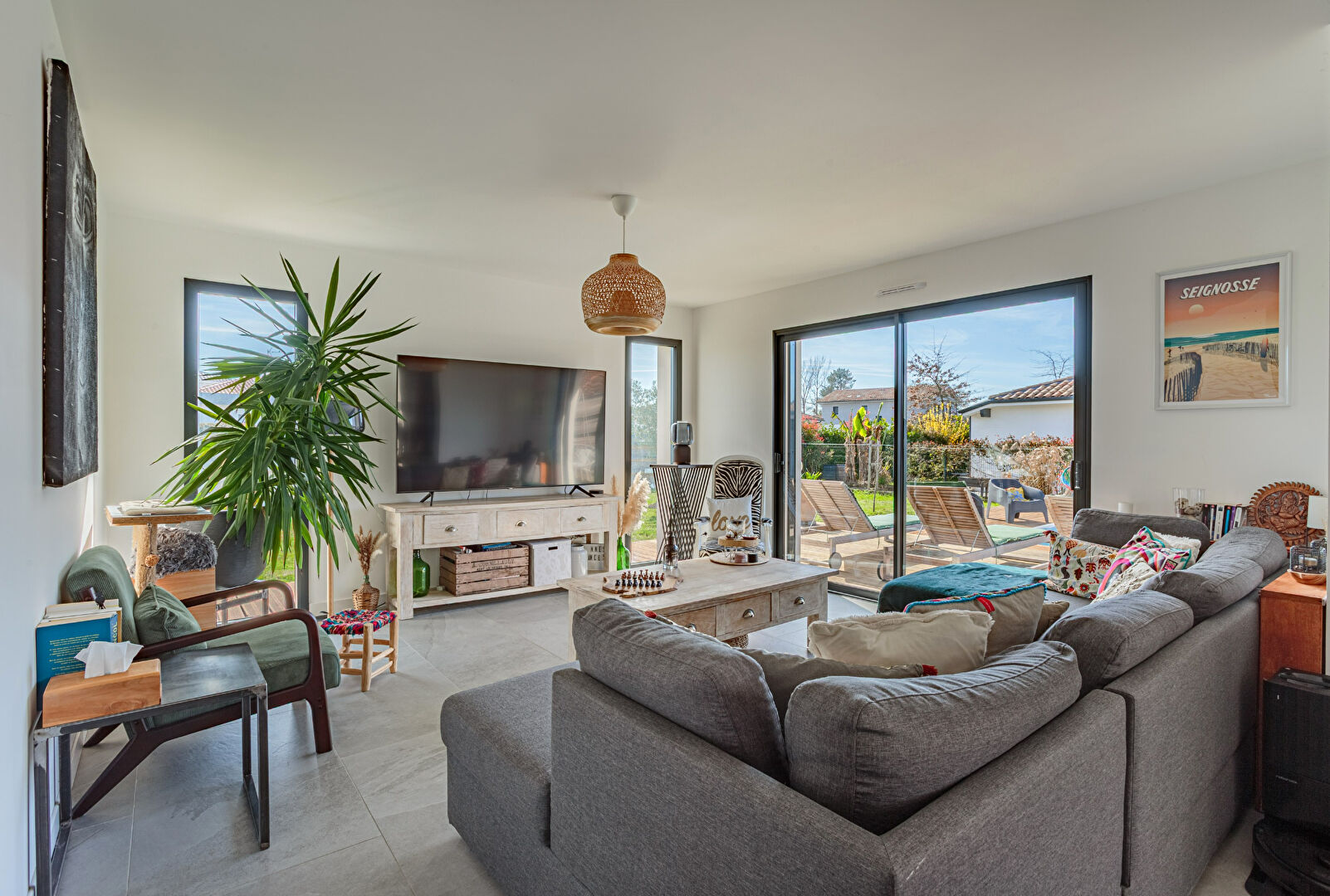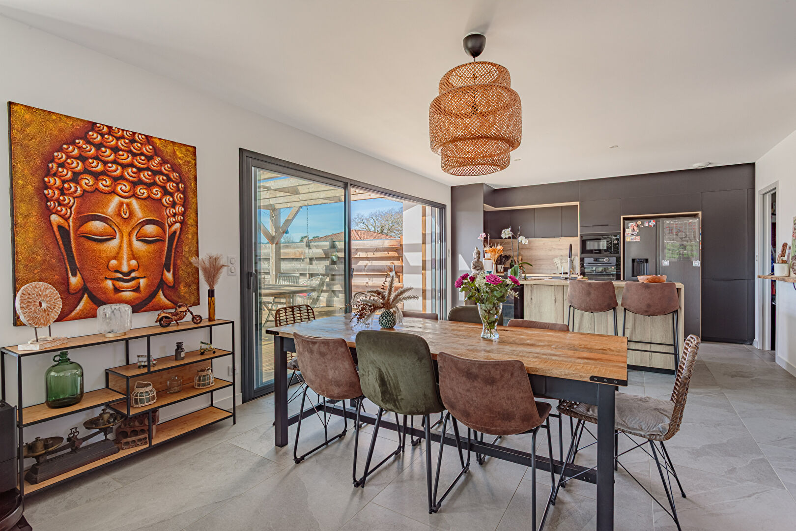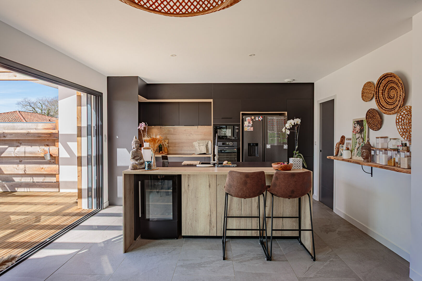 Dès l'entrée, la maison dévoile une vaste pièce de vie de plus de 50 m2 baignée de lumière, ouverte sur les terrasses, la piscine et le jardin. La cuisine contemporaine entièrement équipée, aux lignes élégantes, s'intègre harmonieusement à cet espace convivial pensé pour recevoir.