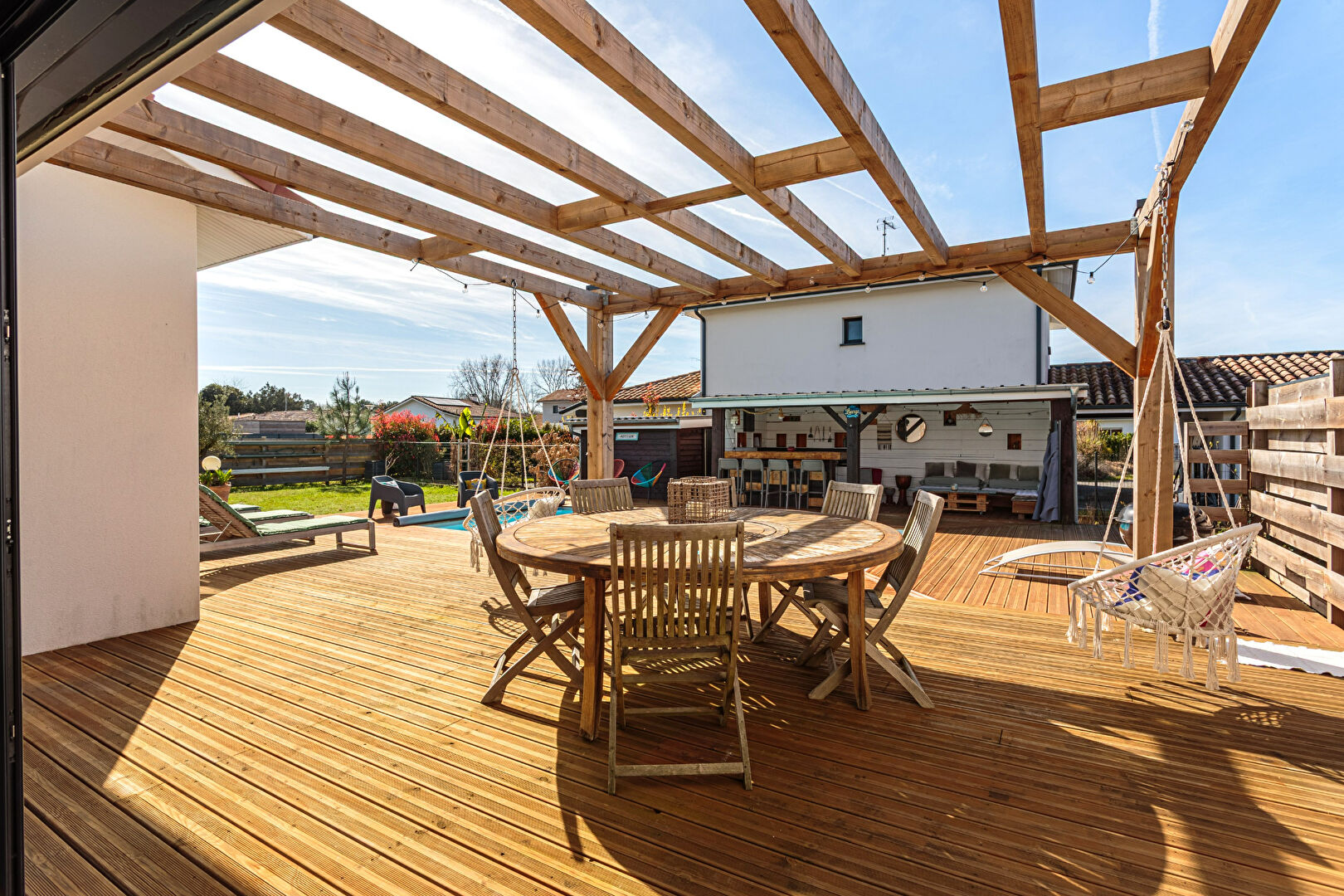 À l'extérieur, terrasses généreuses, jardin, piscine chauffée et bodega composent un véritable lieu de vie dédié à la détente et aux moments de convivialité.