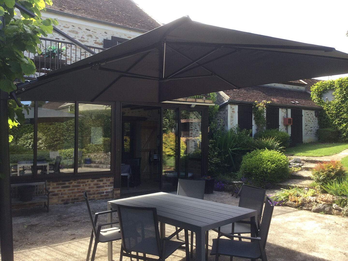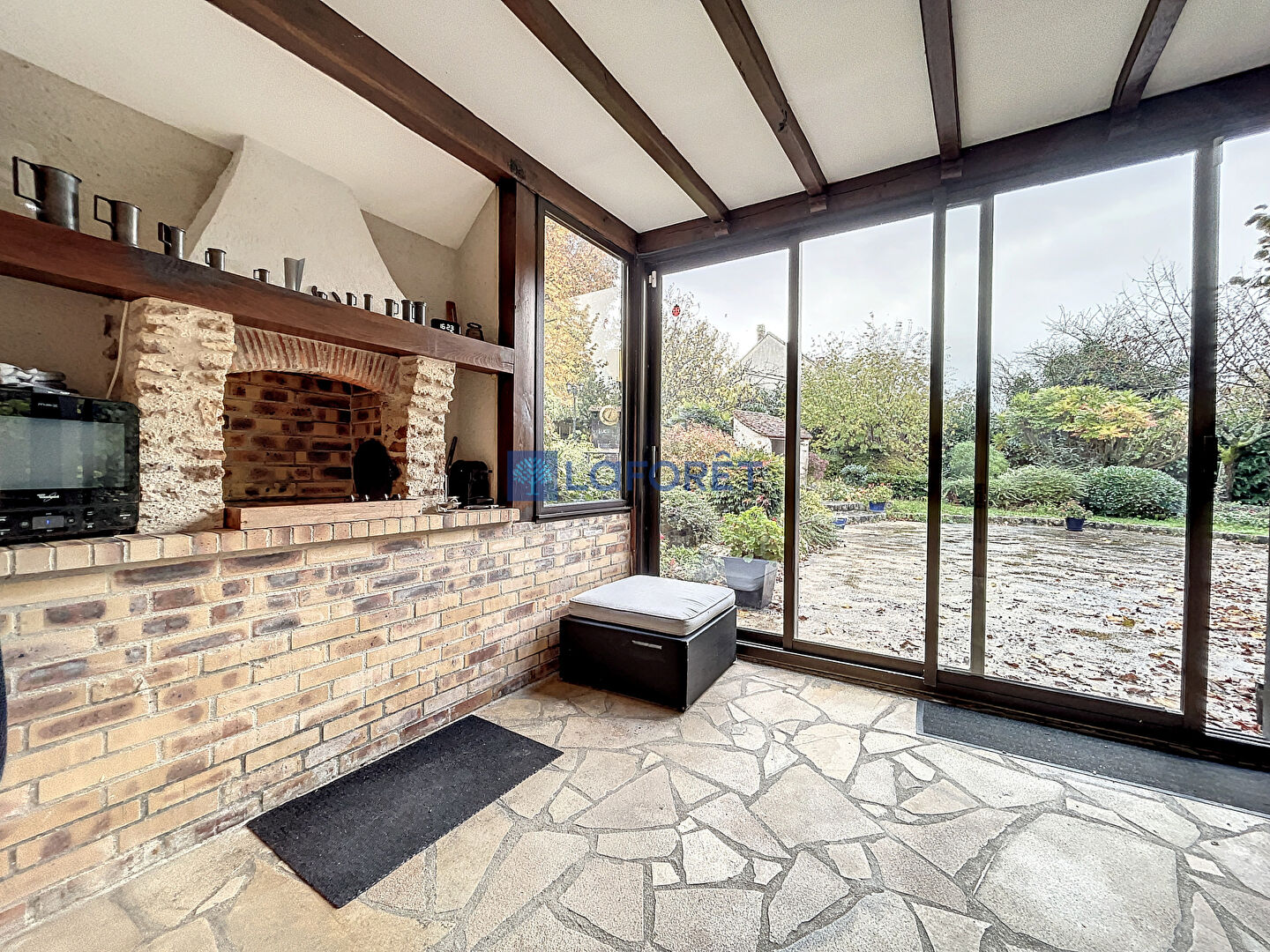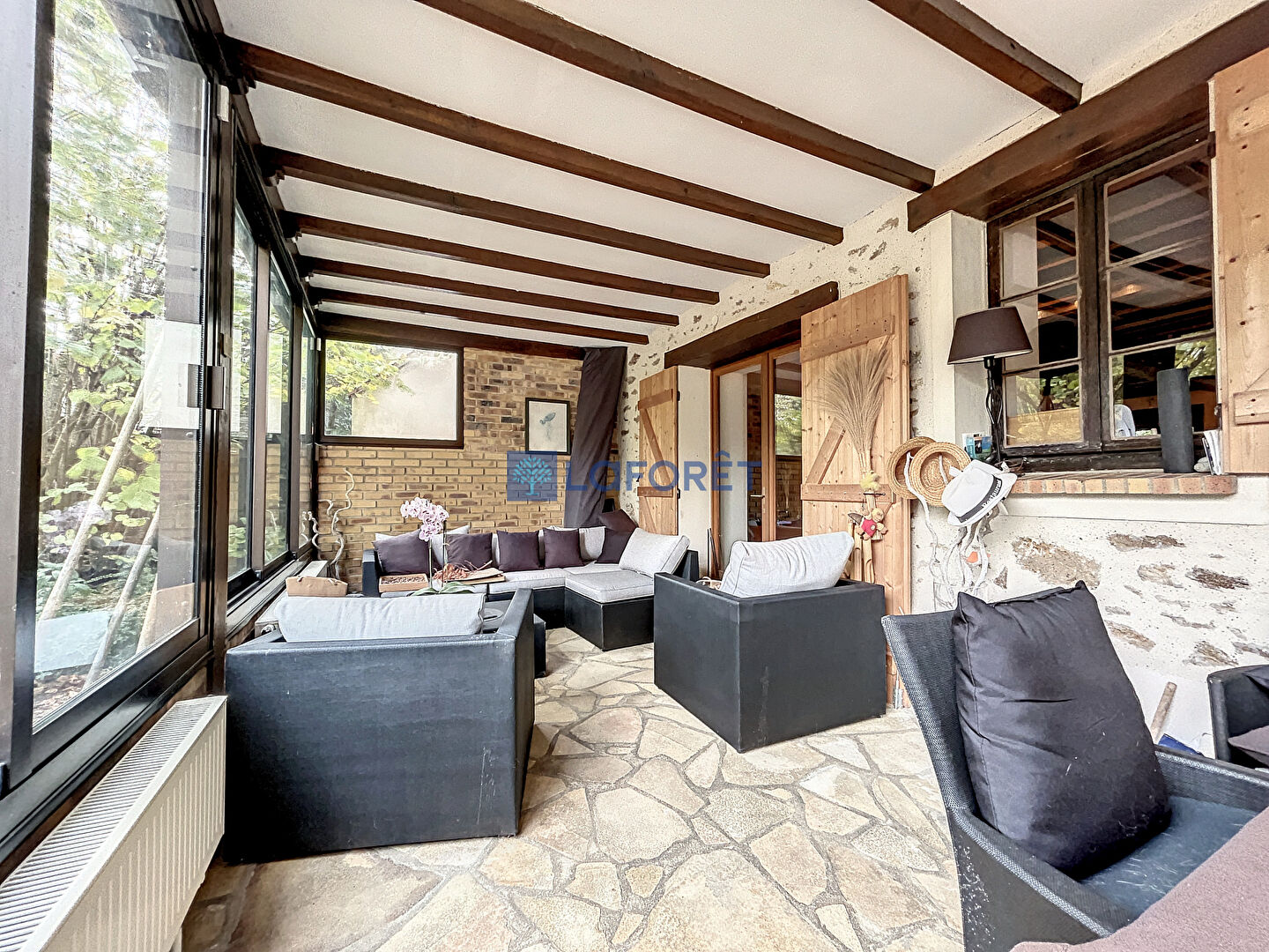 Une véranda lumineuse prolonge l'espace de la cuisine, créant un lien harmonieux entre l'intérieur et l'extérieur. Cet espace polyvalent peut être utilisé pour profiter de la nature tout en étant à l'abri.
