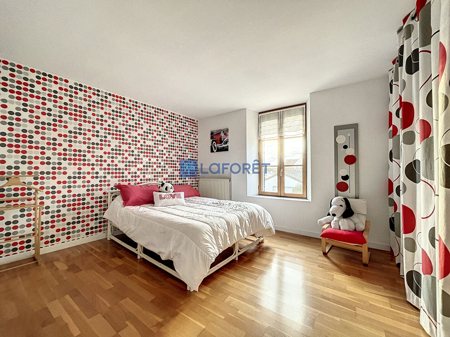 Un couloir dessert trois autres chambres, dont deux s'ouvrent sur une terrasse offrant une vue imprenable sur le jardin, un dressing aménagé et une salle de bains avec un w.c.
