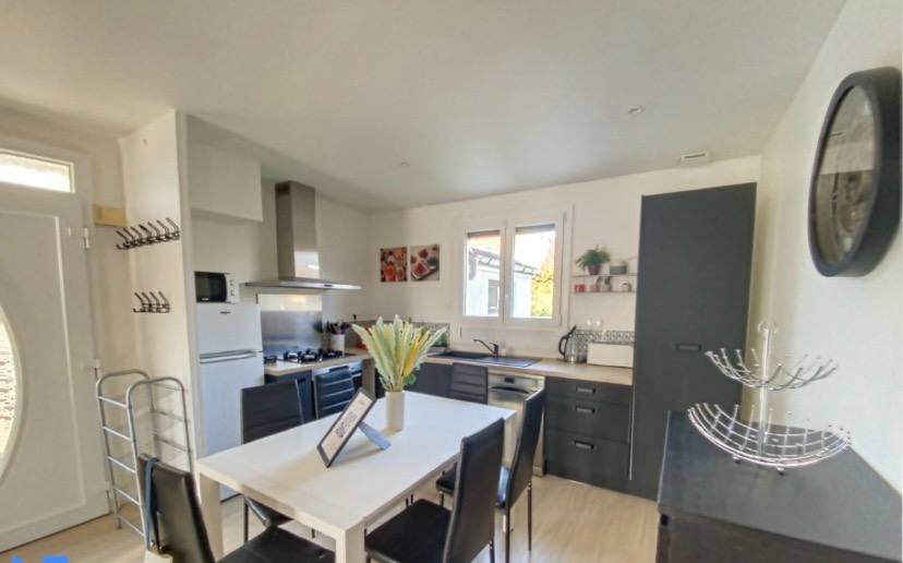 La maison dispose d'une entrée ouvrant sur un salon convivial équipé d'un poêle à bois, avec cuisine ouverte aménagée et entièrement équipée, formant un bel espace de vie chaleureux et fonctionnel.