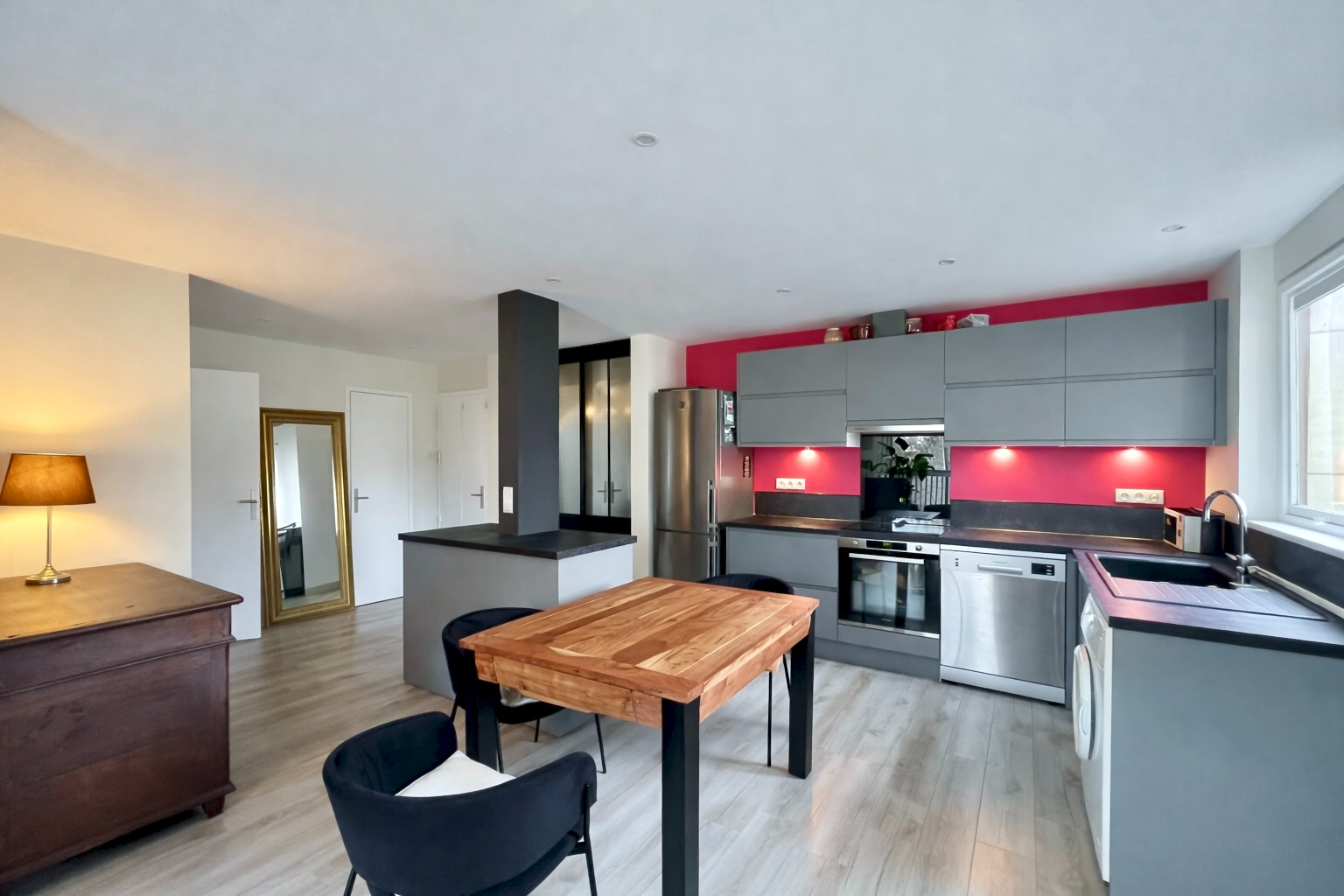 Au 2e étage avec ascenseur, ce bien lumineux vous offre l'accès à un vaste séjour salle à manger de 40 m² avec grande cuisine américaine aménagée et loggia fermée offrant une vue dégagée sur le parc de la copropriété.