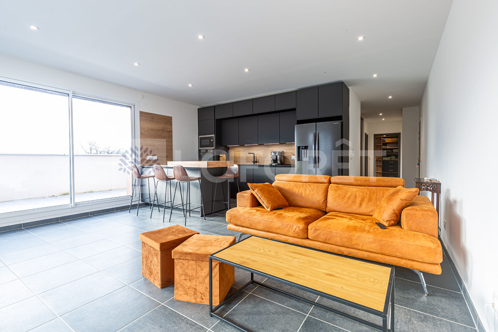 - Espace de vie : Une entrée accueillante avec placard intégré mène à une vaste pièce de vie comprenant un séjour chaleureux et une cuisine entièrement équipée. Cet espace s'ouvre directement sur une grande terrasse en angle exposée Sud, idéale pour profiter d'une lumière optimale.