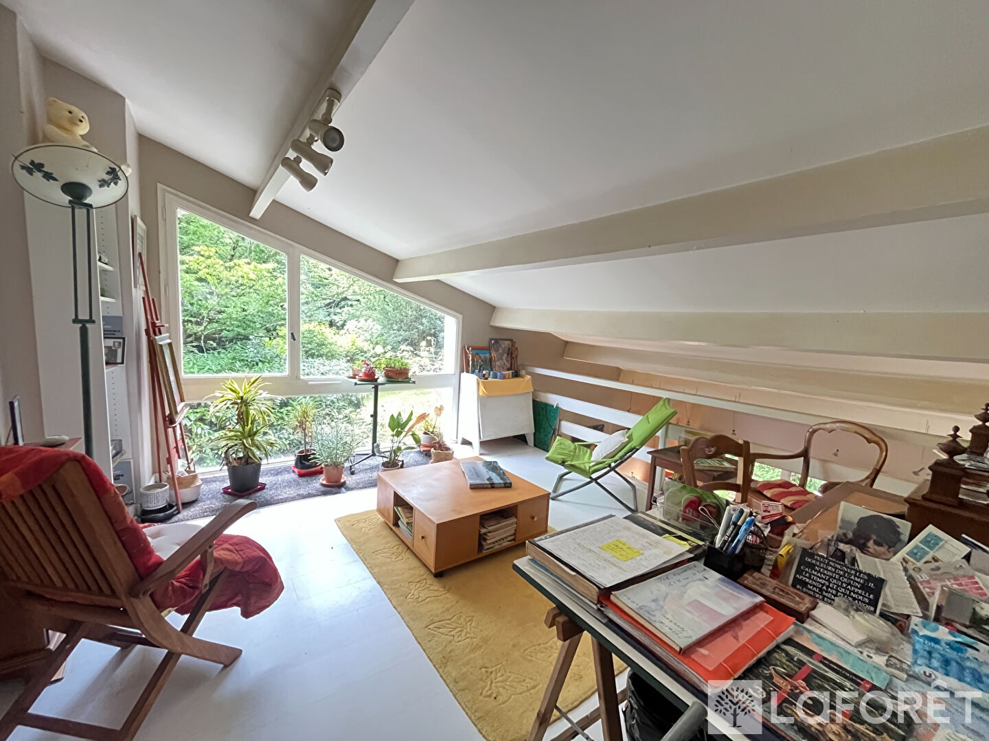 À l'étage, une mezzanine de 20 m² surplombe le séjour et dessert un bureau ainsi que deux chambres supplémentaires.