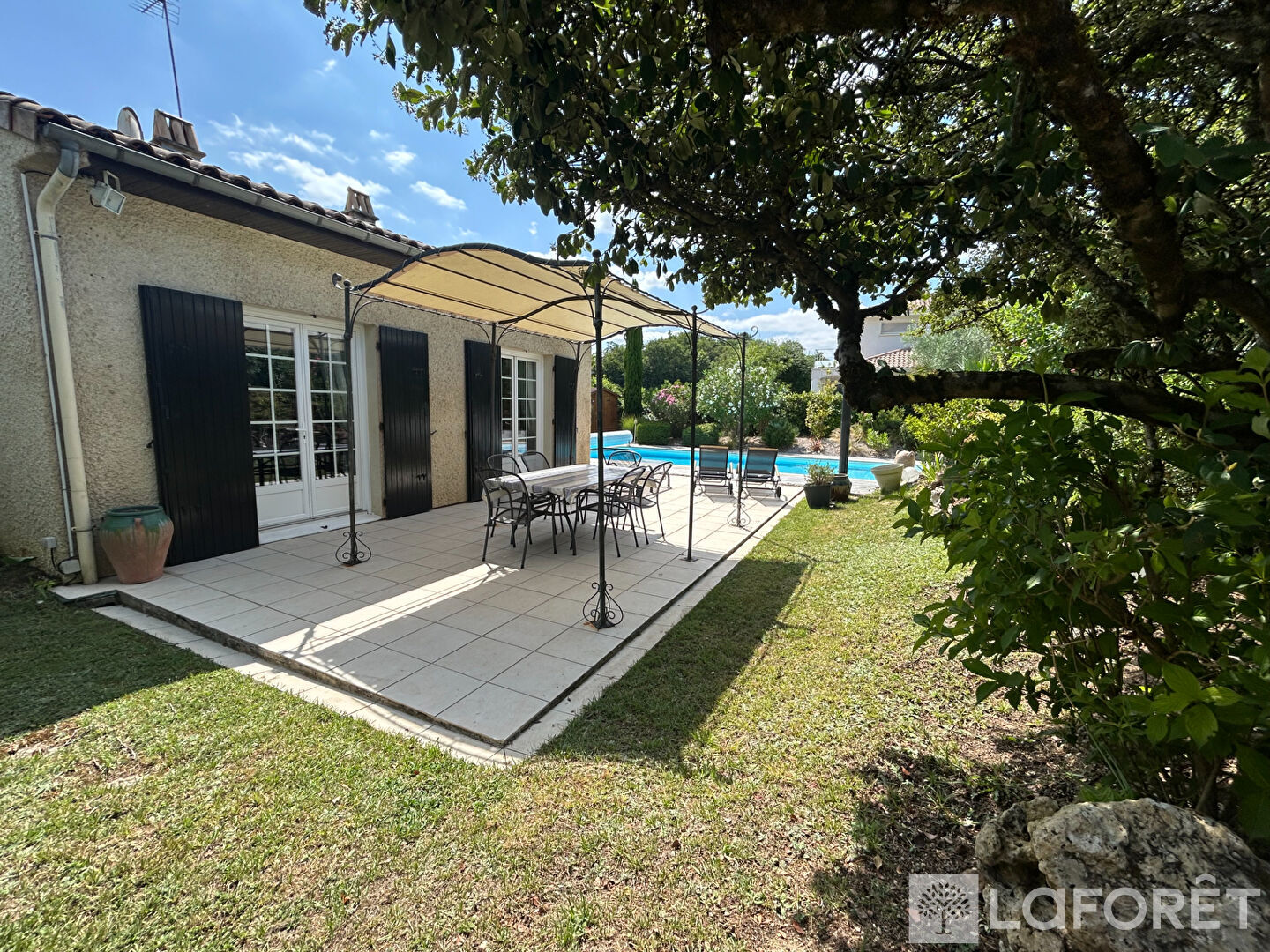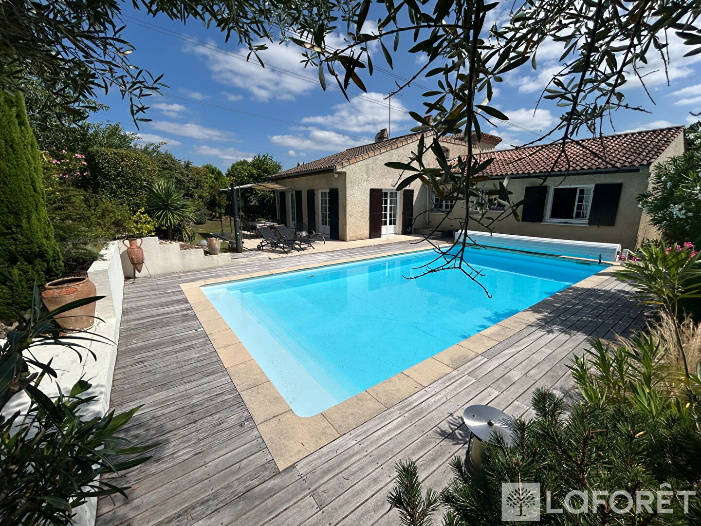 À l'extérieur, la maison s'ouvre sur un jardin paysager de plus de 1 000 m², parfaitement entretenu, offrant une terrasse agréable pour les repas en plein air. Une piscine chauffée vient parfaire l'ensemble, offrant un confort certain en toute saison.