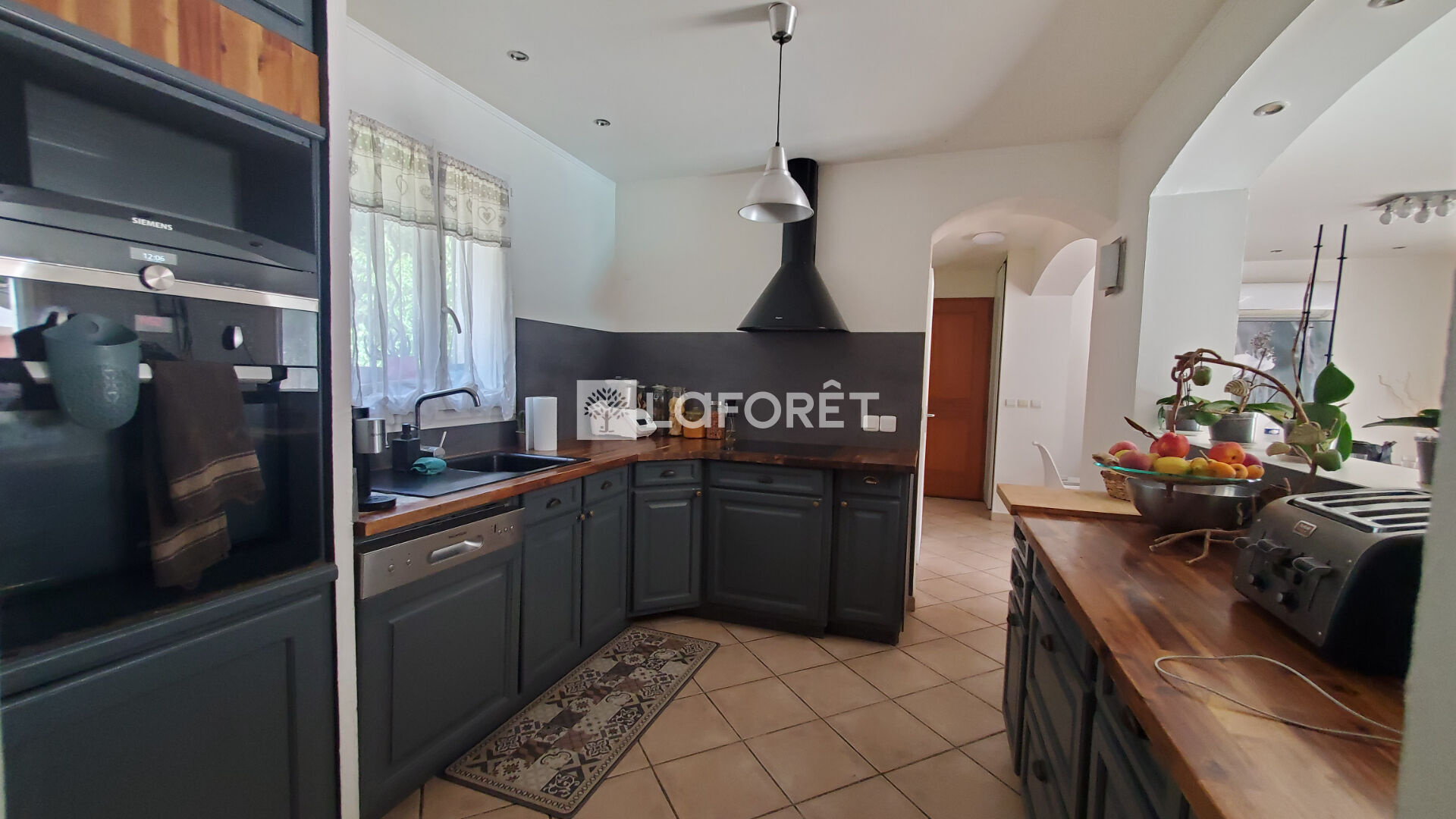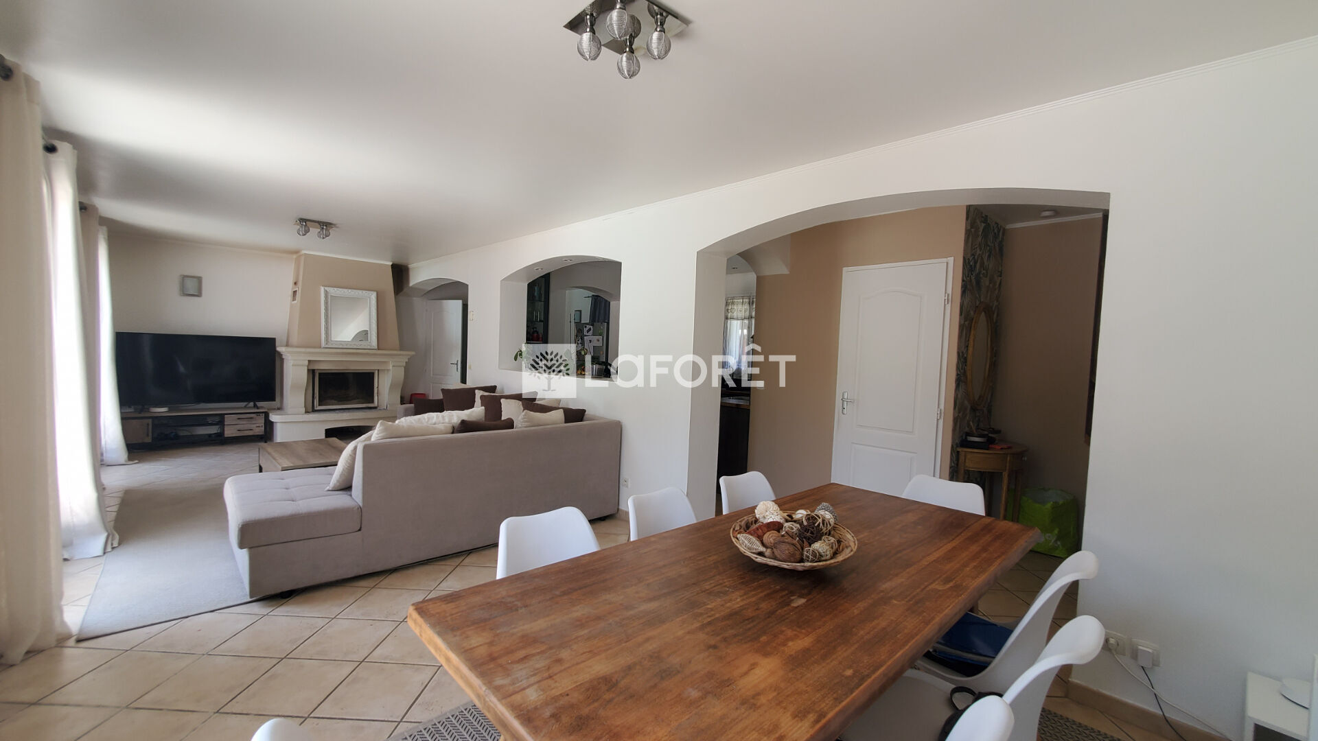 La maison offre un espace de vie chaleureux avec cheminée, une climatisation réversible, et quatre chambres, parfaitement adaptées à une vie de famille.