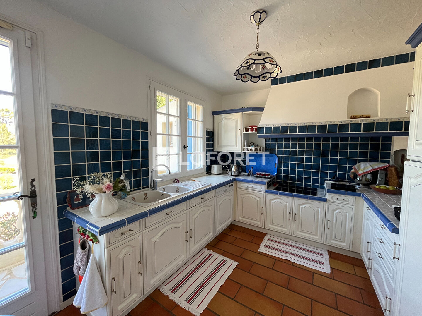 La villa se compose au RdC d'un double séjour d'environ 50 m² avec cheminée insert, une cuisine, une chambre et un WC, ainsi qu'un T2 indépendant comprenant séjour avec climatisation réversible, cuisine, chambre et salle de bains. Le T2 a son entrée indépendante également.