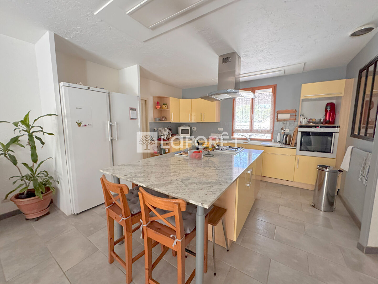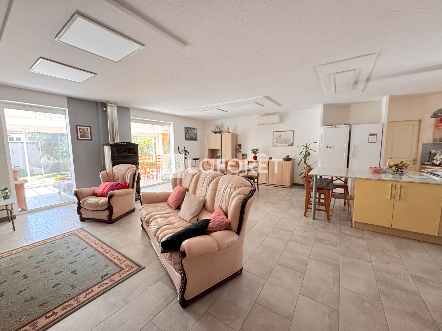 Elle se compose d'un hall d'entrée, un double séjour avec un grand poêle à bois (qui fait aussi chauffe plat) et une cuisine américaine avec îlot central. Ce grand espace de plus de 50 m² donne sur une véranda de 27 m².